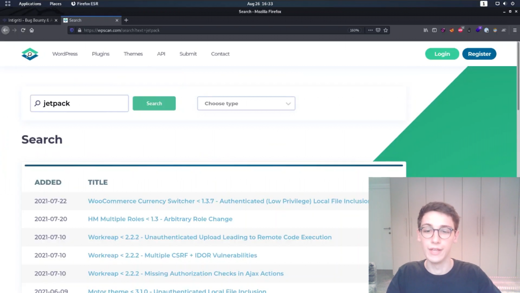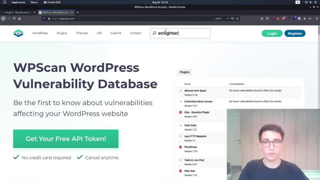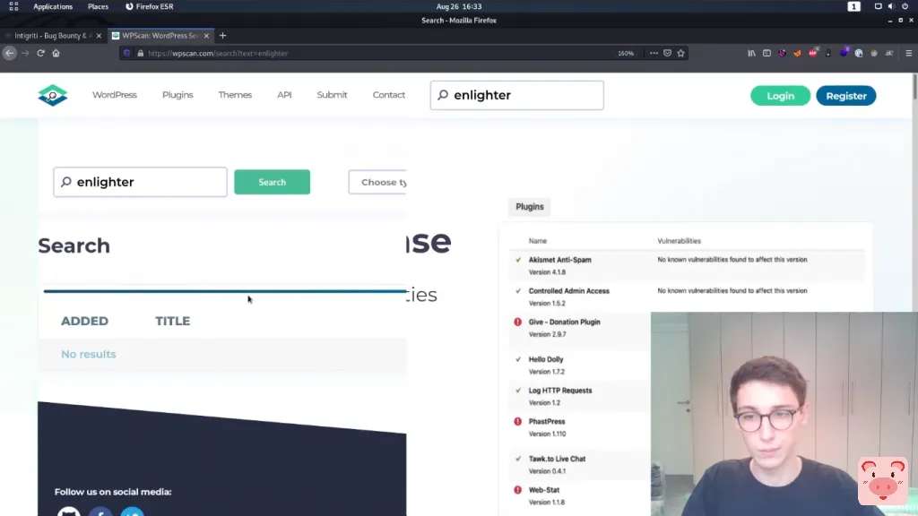 你可以提供一个API令牌,这将做的是,将去检查与数据库的脆弱插件,以找出是否有一个漏洞为某个版本。 然而,你每天只能免费提出一定数量的请求,所以我主要喜欢手动操作。让我们来试试吧。让我们看看这个Enlighter的,可能会很有趣。它是否有任何漏洞?我们可以去wpscan.com,然后我们可以直接搜索,我们会看到没有任何结果返回好的,所以这里面可能没有任何公开的漏洞。