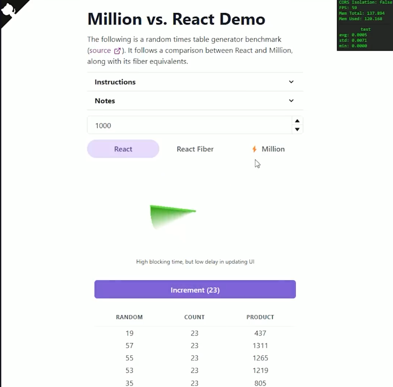 此外,它提供了一个实时演示,您可以在其中并排比较React和Million的表现。