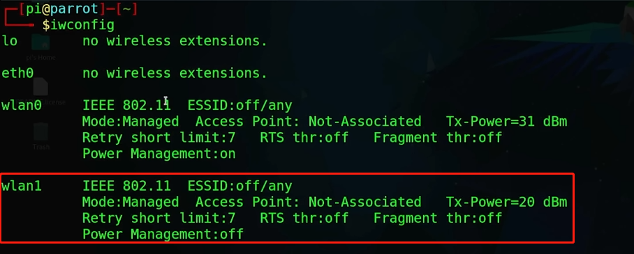 在插入外接Wifi适配器后,输入iwconfig,就可以看到网卡了