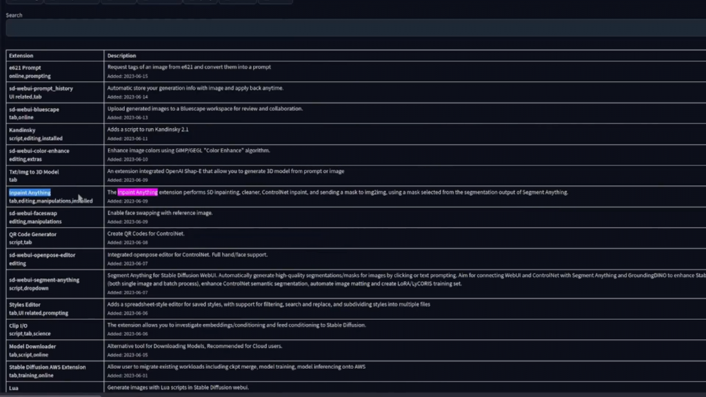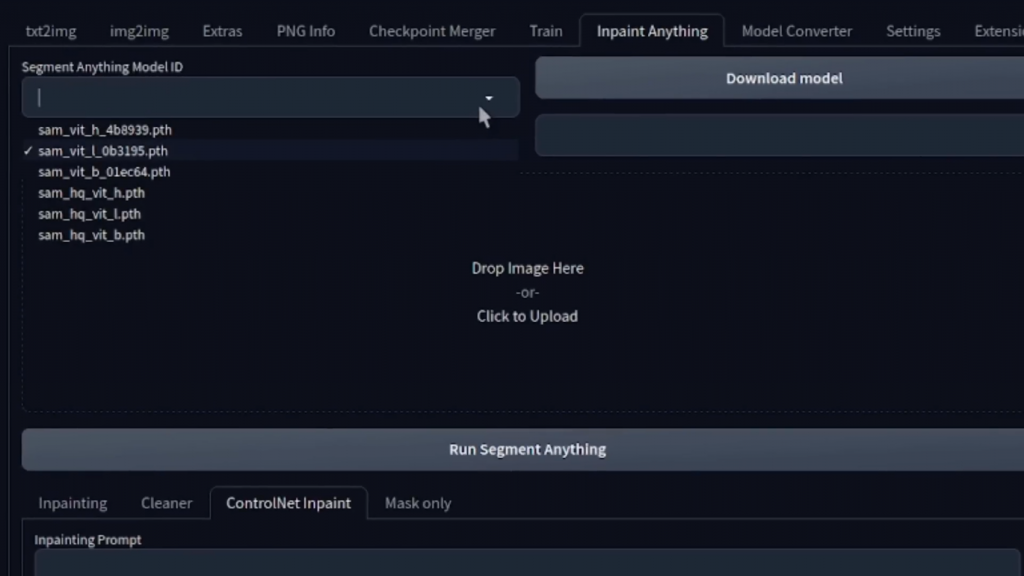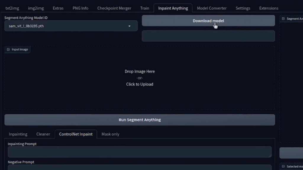 对于in paint anything扩展,模型的下载可以直接从in paint anything标签中完成, 所以这比用ControlNet更容易。因此,只是为了总结一下这个in paint anything扩展的确切步骤的安装过程,你需要从可用的标签中安装in paint anything,进入已安装的标签并点击应用和重启,最后进入in paint anything标签并下载一个模型。