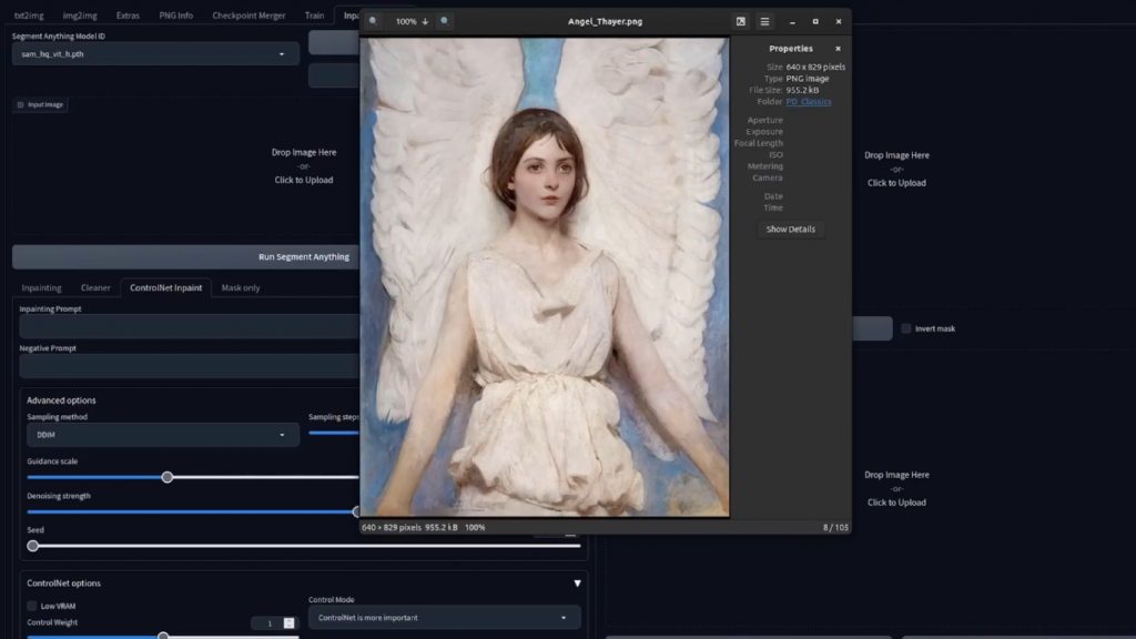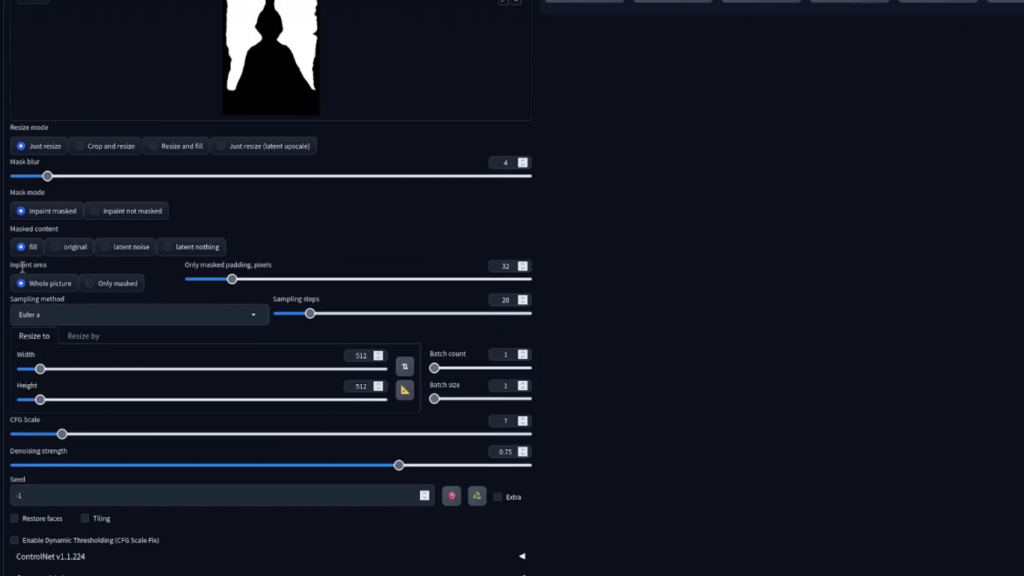 蒙版非常方便,因为这样你就可以向下滚动,在绘画中发送图像到图像,并继续做所有你通常会做的事情,所以在这里你可以选择蒙版内容原件,选择任何采样方法,并添加任何你喜欢的ControlNet就像你通常做的那样。