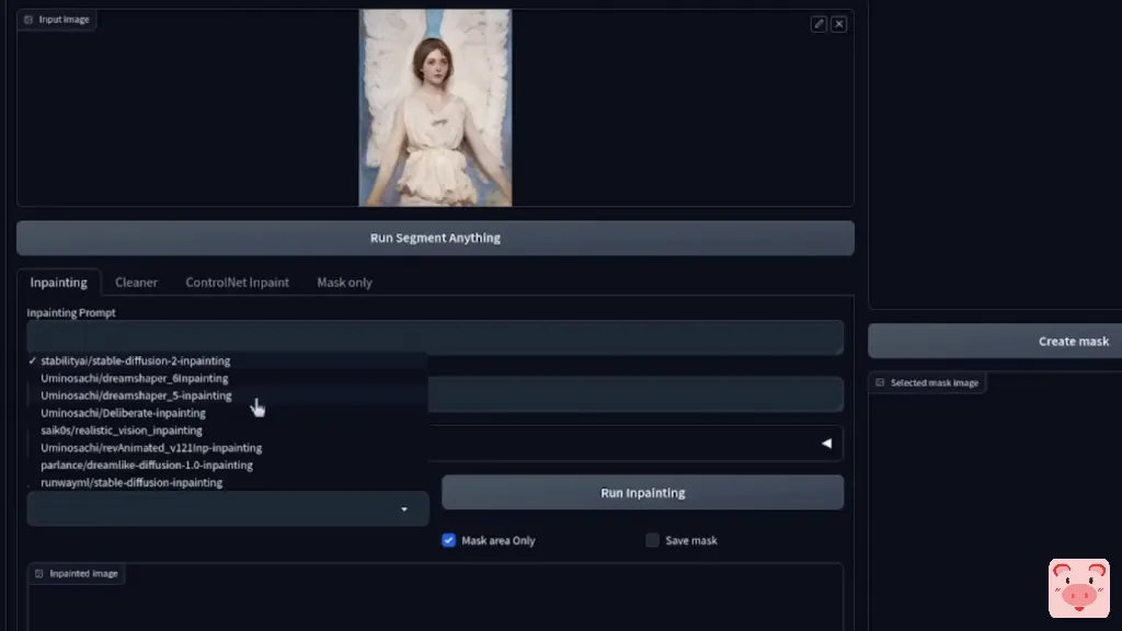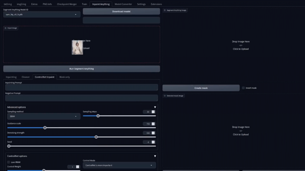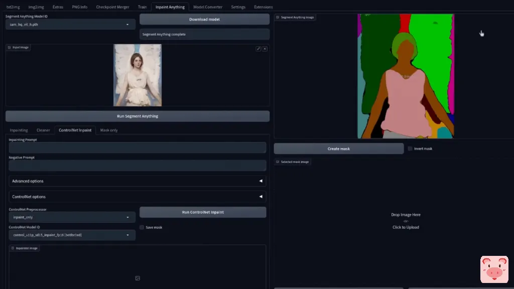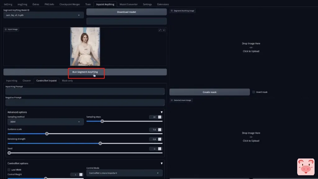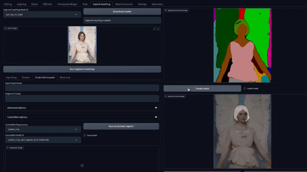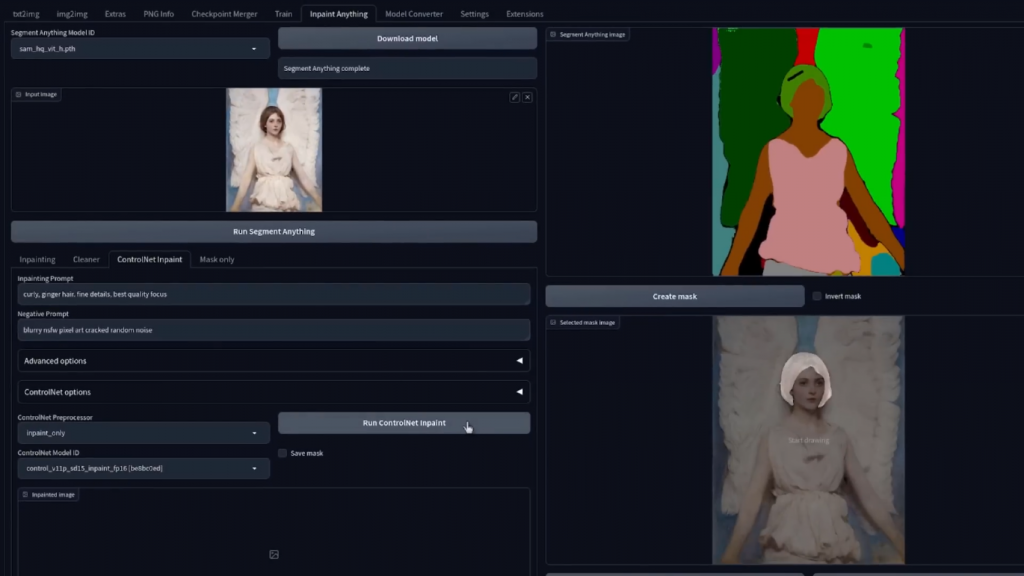 好了,现在你已经安装好了一切,是时候分段了。使用默认值的基本三步程序是非常快速和简单的。你所要做的就是提供你的图像,点击运行segment anything,选择你想要的段,点击创建蒙版,选择你的文本提示,最后点击Run ControlNet Inpaint。