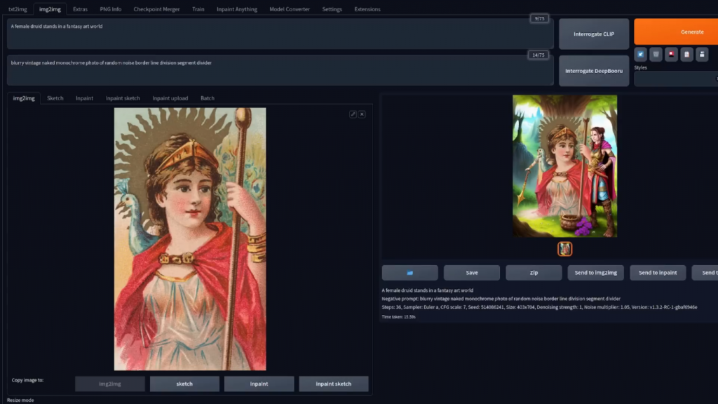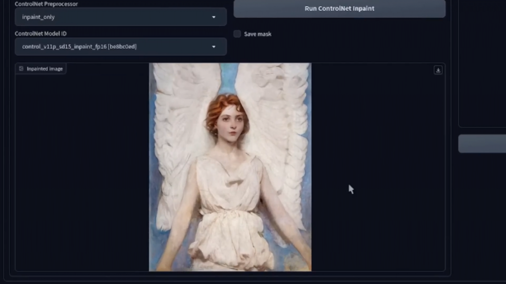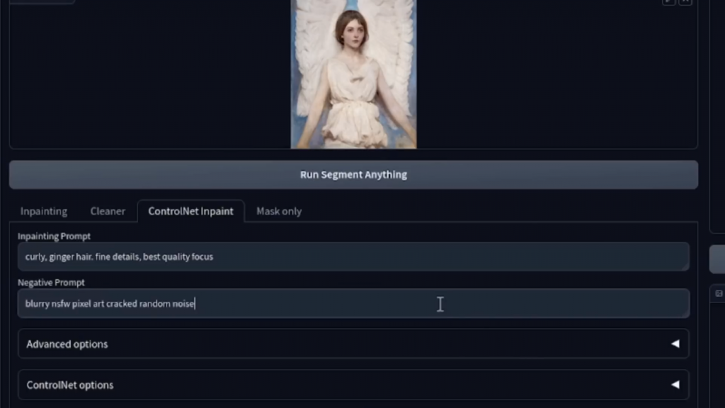 由于光标是一个小黑点,在一些黑色区域可能相当难看,但是,嘿,那里也有一个反转蒙版的选项,如果你希望除了你选择的那部分之外的所有东西。我在左边的ControlNet Inpaint标签上, 对于正面的提示,我要有一些卷曲的姜发,我也要在那里扔一点负面的提示,所以最后的事情就是点击Run ControlNet Inpaint。