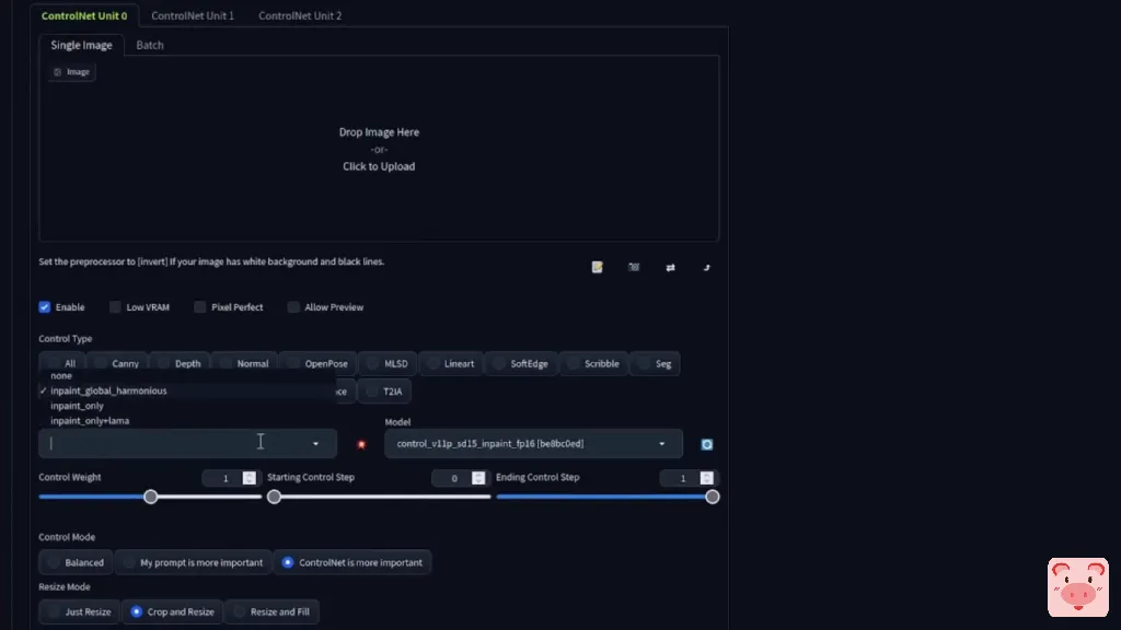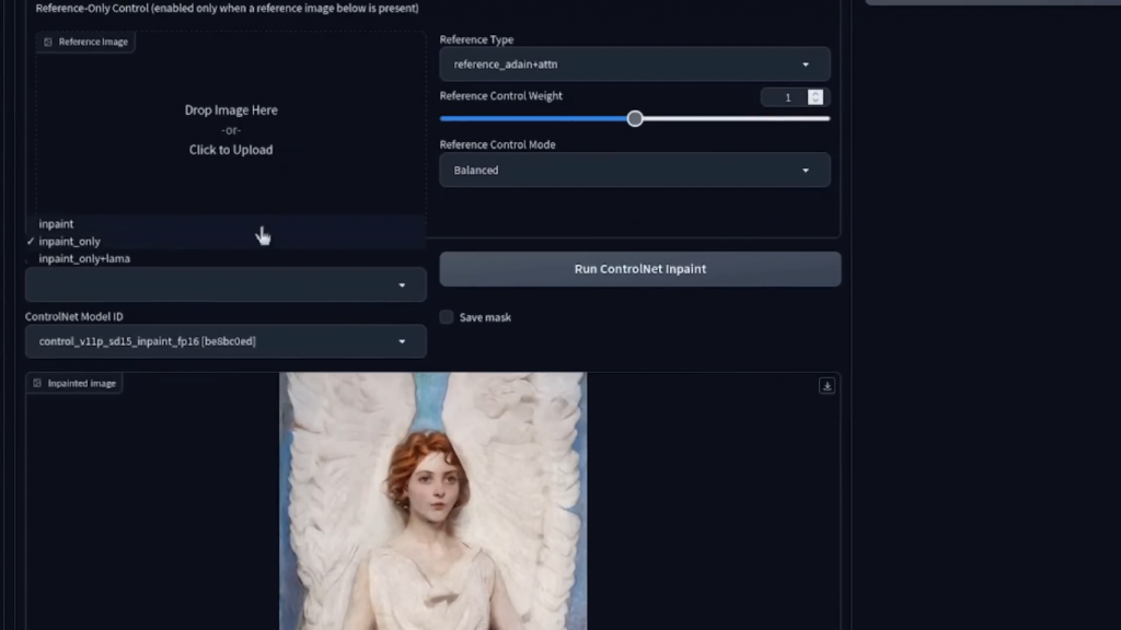 但你也可以选择inpaint_only+lama。inpaint是相当体面的,只是改变了整个图像,它实际上并不使用你创建的蒙版,所以我倾向于完全忽略这个选项。inpaint_only是相当新的,是随ControlNet 1.1而来的,和inpaint_only+lama几乎完全一样,但结果可以更干净一点。你也有各种标准的ControlNet选项,如模式和仅参考ControlNet,如果你还想将它们紧凑地放在这个界面中。对于其他的一些标签,我们已经有Inpainting,这是基本Inpainting,基本上是老办法,而且它不使用你的正常模型,它只使用那里列出的模型,是扩散器格式的,所以如果你使用那个标签中的任何东西,你可能必须下载,我个人倾向于忽略它。