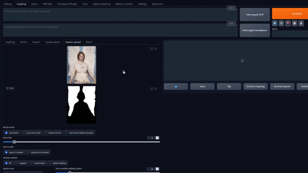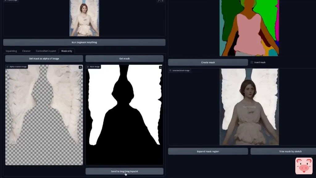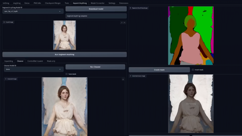 这允许你将图像的一些区域清空,如果你使用同一个天使,我选择她的翅膀,在那里做一个蒙版,然后在上面运行清洁器,