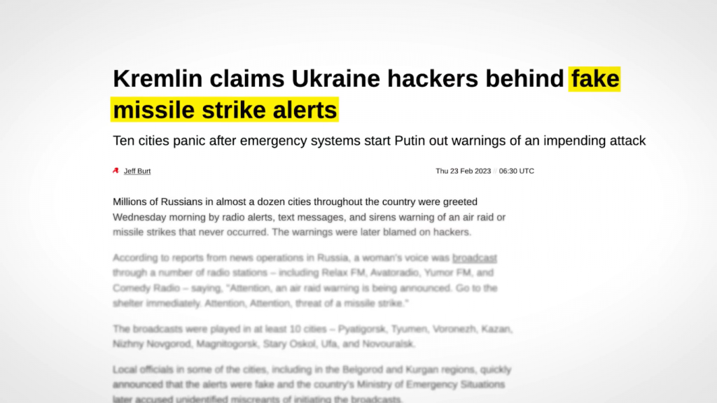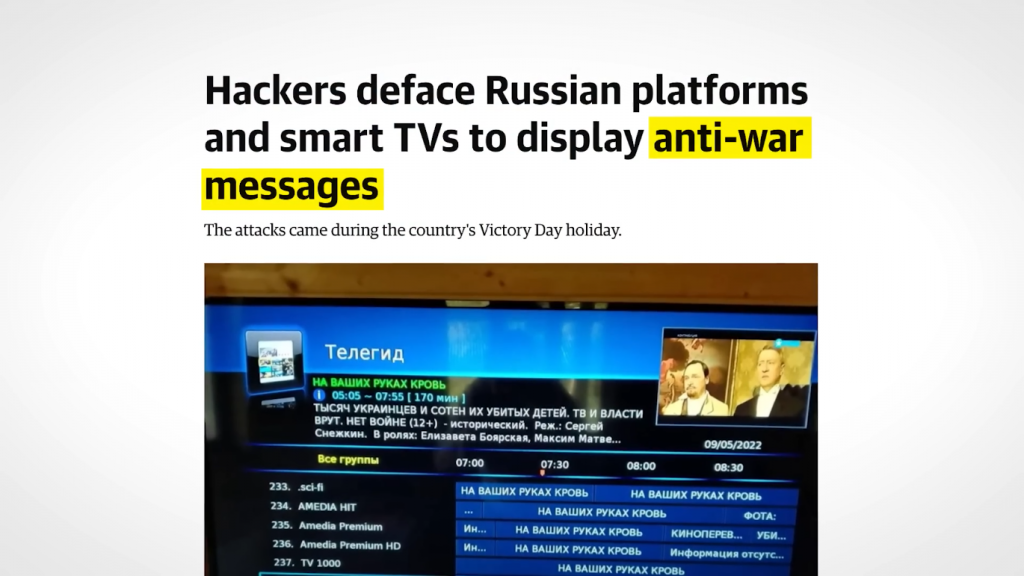 - 俄罗斯电视和广播站被黑客攻击,播放虚假的普京讯息。
