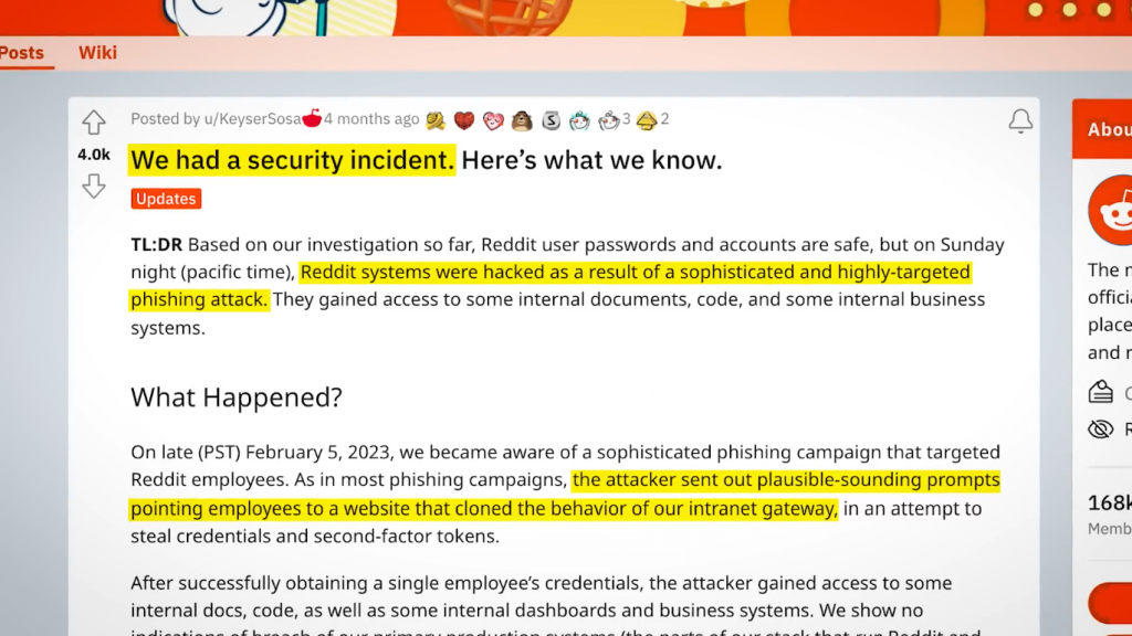因此,实际的黑客攻击发生在4个月前,但为什么黑猫要花这么长时间来承担责任?好在当时reddit承认他们被入侵了。他们说,reddit系统被黑是由于复杂和高度有针对性的网络钓鱼攻击的结果。攻击者发出了听起来很有道理的提示, 将员工指向一个克隆我们互联网网关行为的网站,然后窃取证书和2FA令牌。