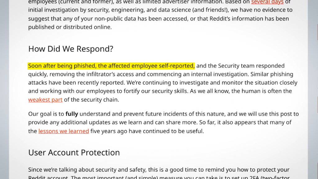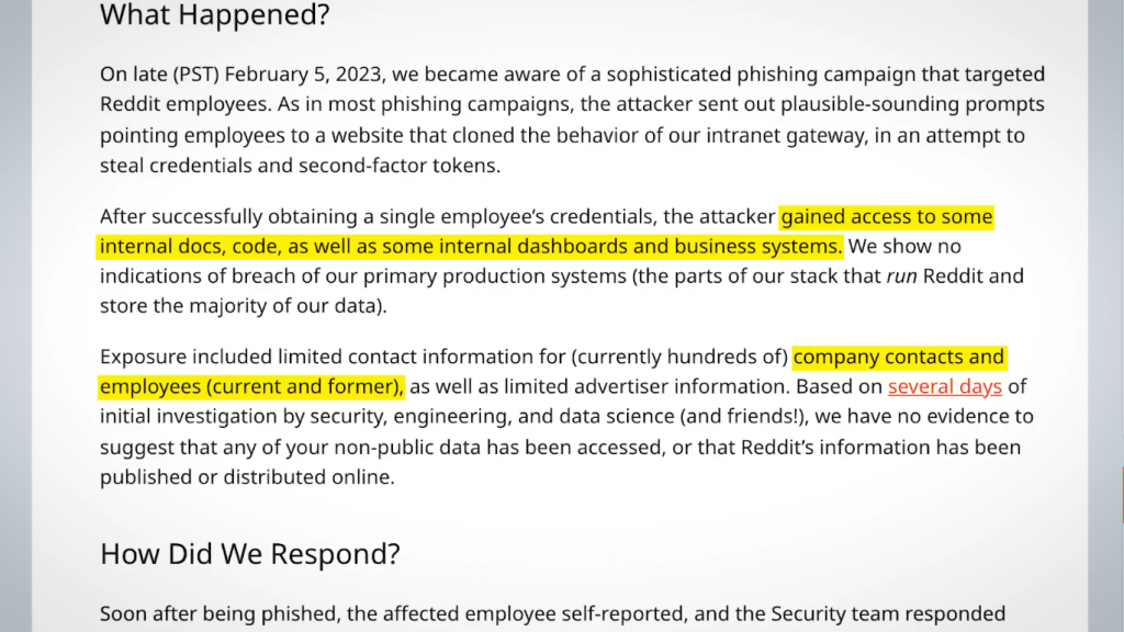 但在此之前,黑客能够获得对内部文件、代码以及一些内部仪表盘和业务系统的访问。他们还窃取了公司联系人和员工的联系信息,但没有任何迹象表明reddit的用户数据被泄露,或者我们被告知。
