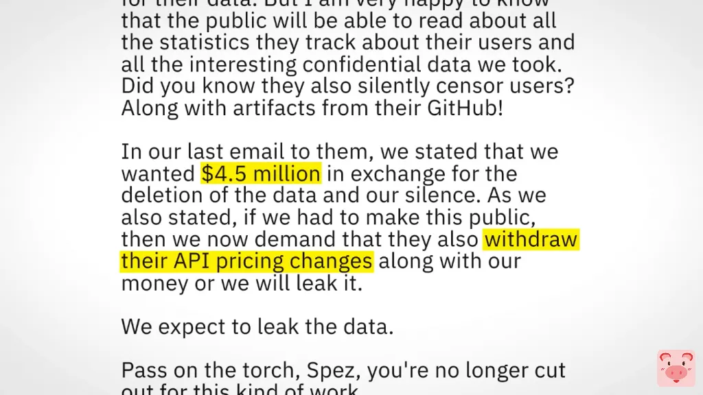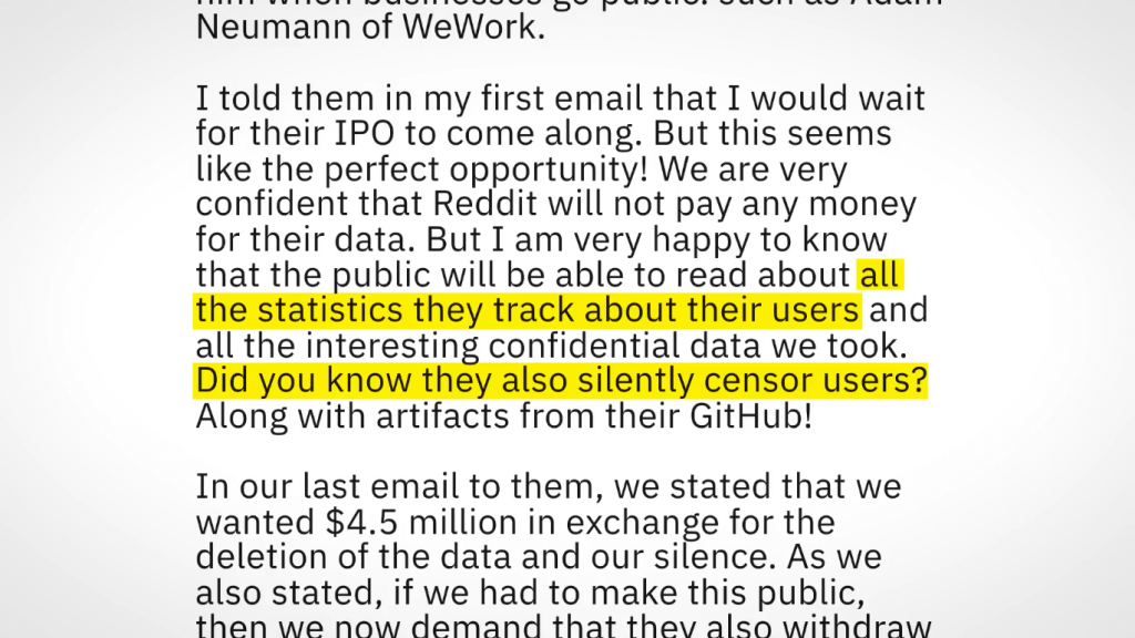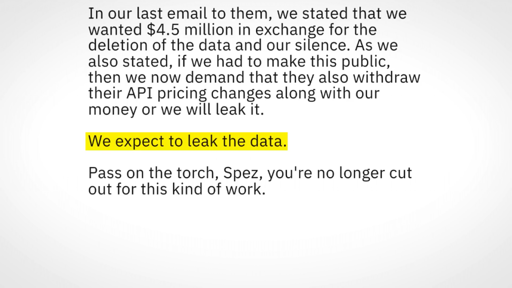 但黑猫显然没有等到那个IPO,而是说这似乎是个完美的机会。他们当然是指Reddit最近的API价格涨价事件,这将会淘汰大量的第三方应用程序。现在,黑客想要从Reddit那里得到的不仅是微不足道的450万美元,作为删除数据的代价还想让Reddit撤回他们的API价格改变。