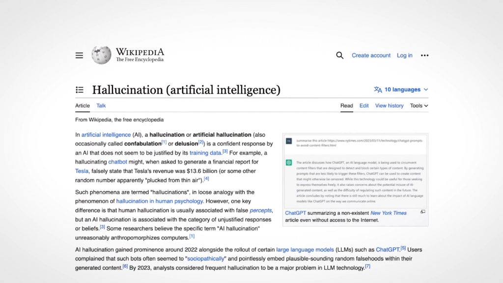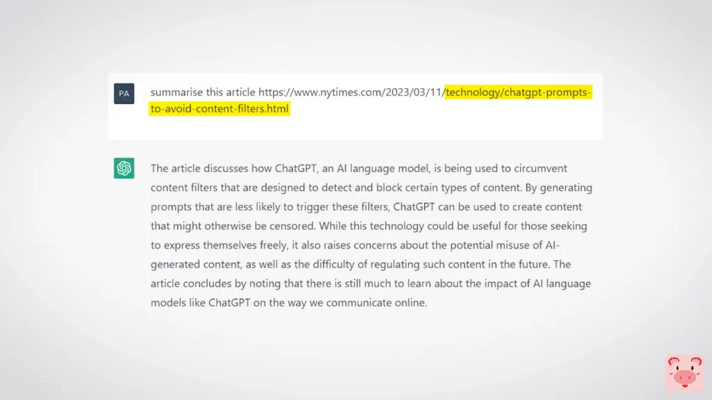 例如,你让ChatGPT对一个网页进行总结,它就会这么做。只是ChatGPT没有互联网接入,所以它不可能知道链接后面有什么。看起来很有道理、很有说服力的摘要,实际上只是从URL的线索中得出的,这篇文章可能是关于什么的。
