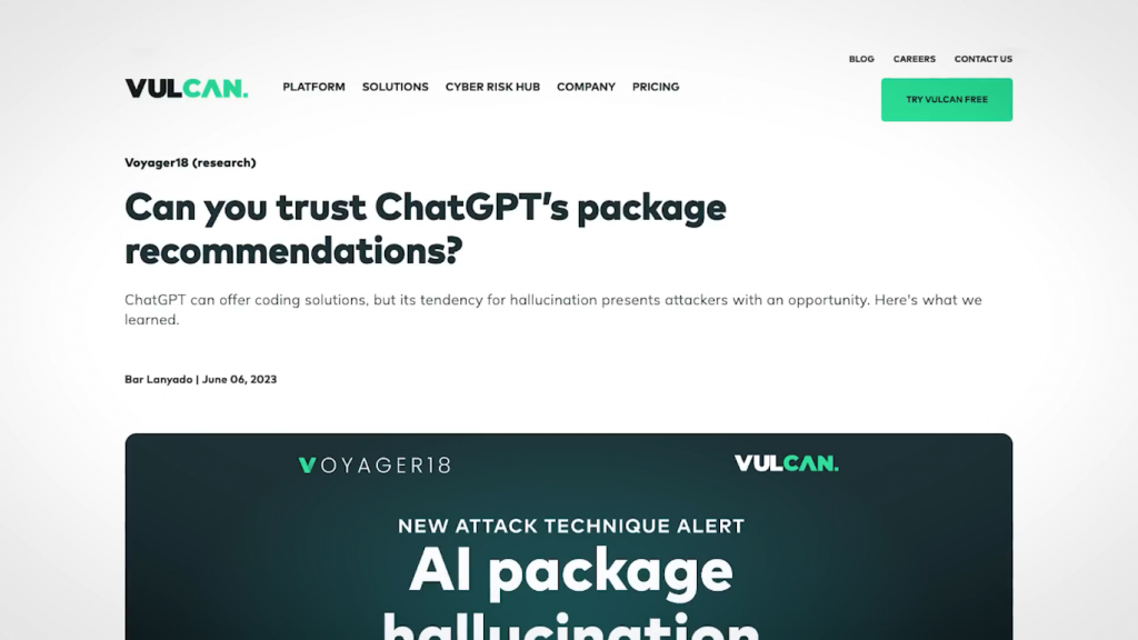 而现在,网络安全公司Vulkan的新研究表明,黑客如何滥用ChatGPT对代码的幻觉倾向, 特别是软件包名称。就像,ChatGPT经常会建议那些从未存在过的软件包,或者那些确实存在的软件包,只是在2021年9月ChatGPT的训练数据截止之前。