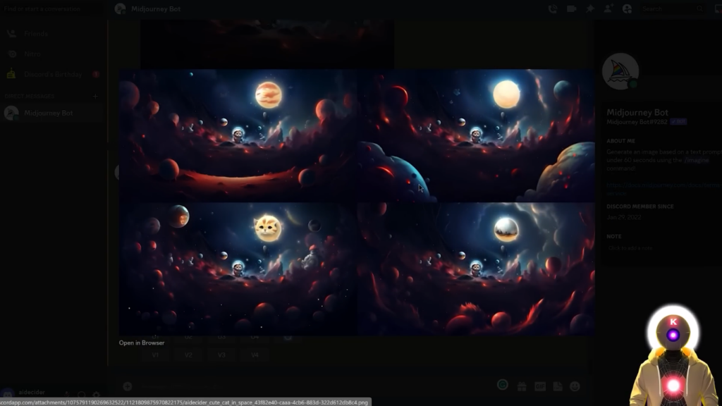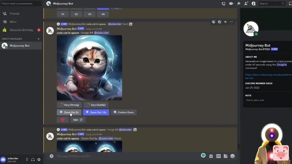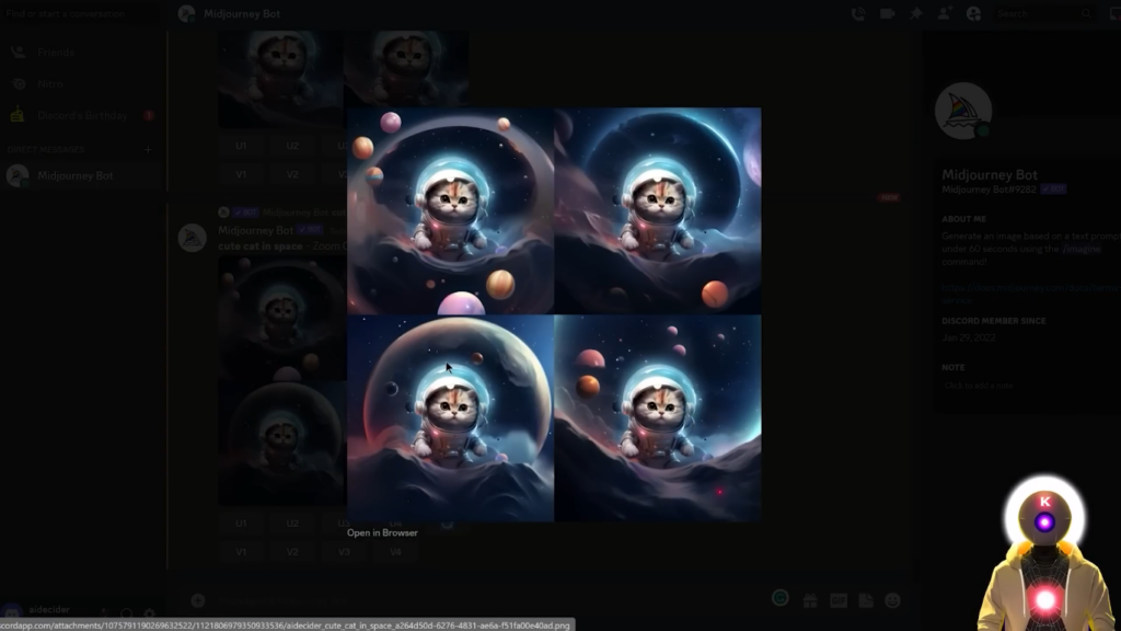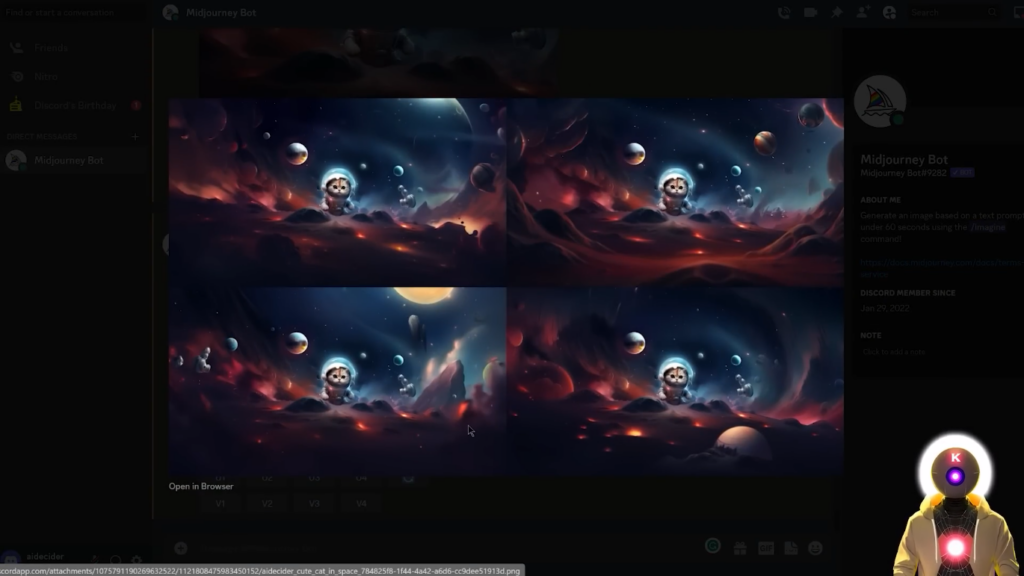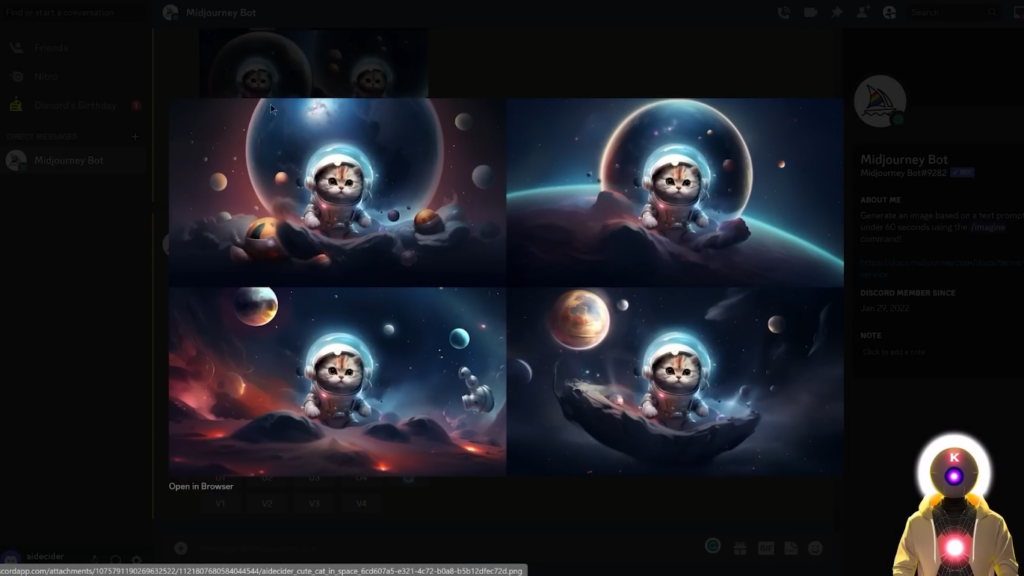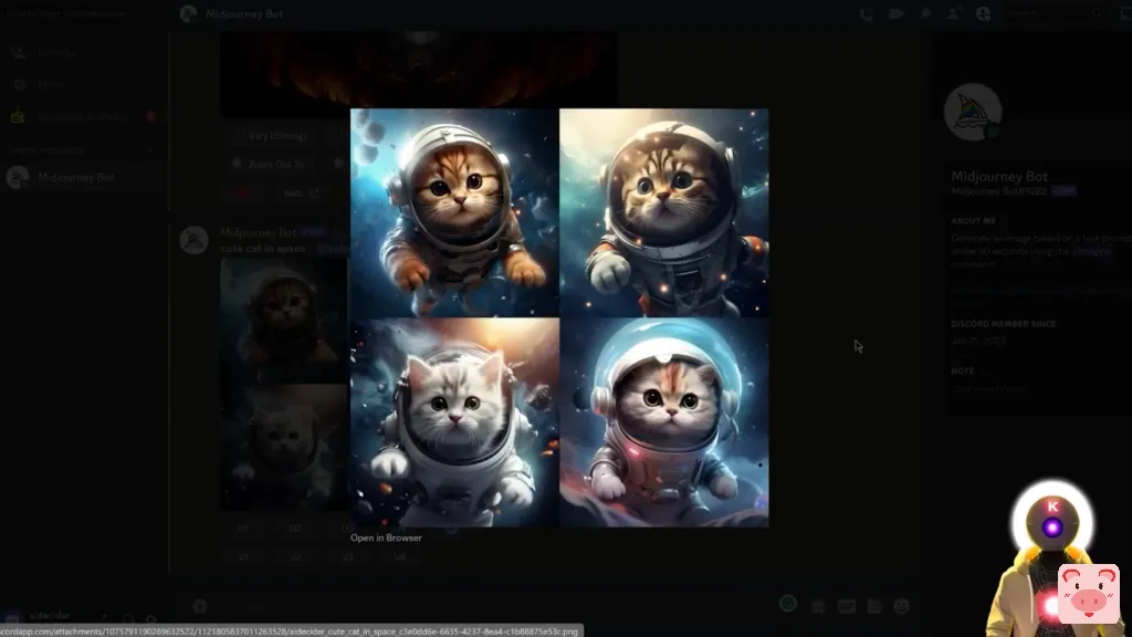 现在除了5.2改进了审美,创造了更清晰的图像,有了更好的连贯性和文本理解,引入的最好的功能之一叫做缩放,这有点像Midjourney图像的扩展功能。所以,比如说我输入一些像太空中的可爱猫咪,会生成这4张非常可爱的图片,它们的质量非常非常高,我的意思是我喜欢这些图片,