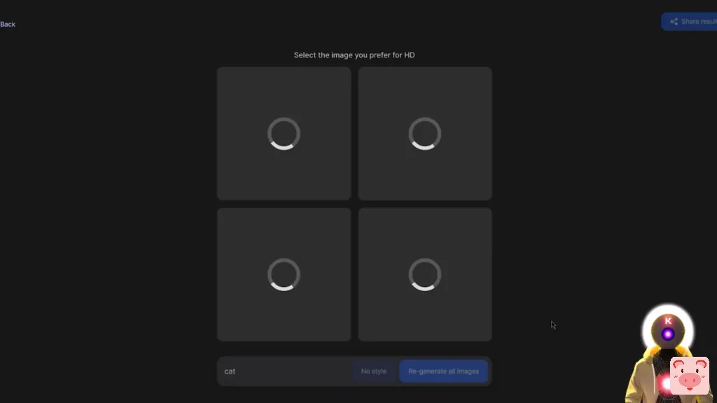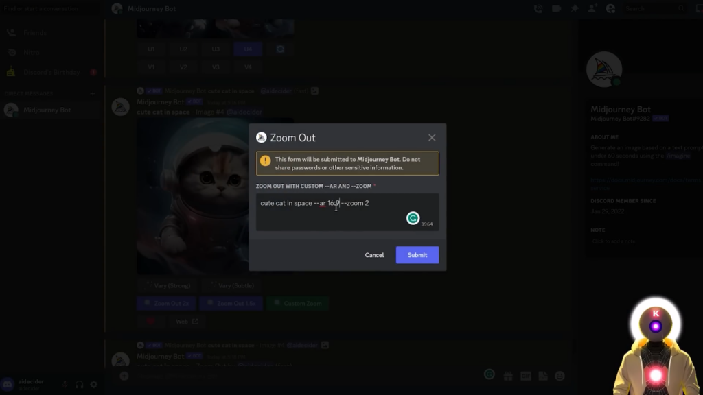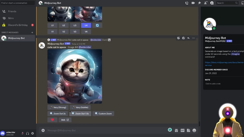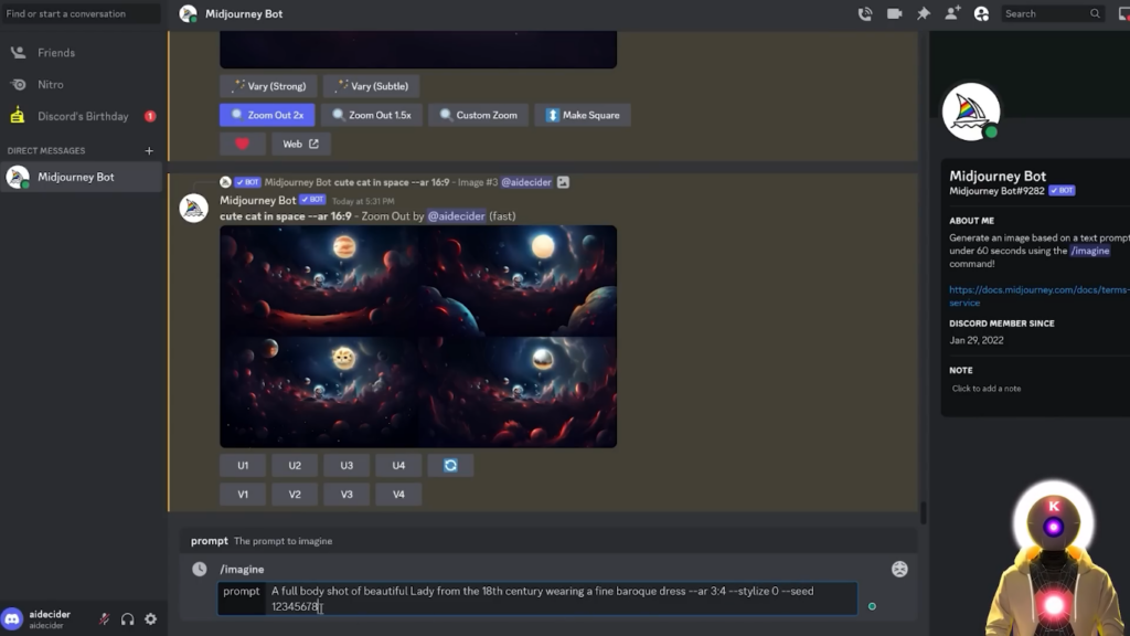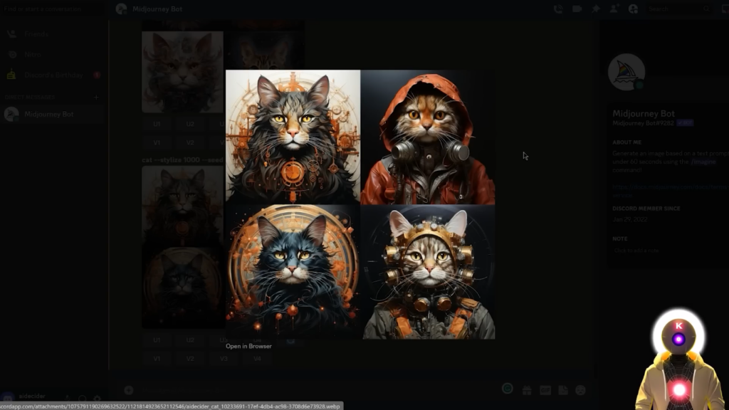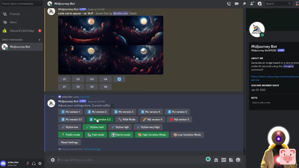 现在除了5.2改进了审美,创造了更清晰的图像,有了更好的连贯性和文本理解,引入的最好的功能之一叫做缩放,这有点像Midjourney图像的扩展功能。所以,比如说我输入一些像太空中的可爱猫咪,会生成这4张非常可爱的图片,它们的质量非常非常高,我的意思是我喜欢这些图片,