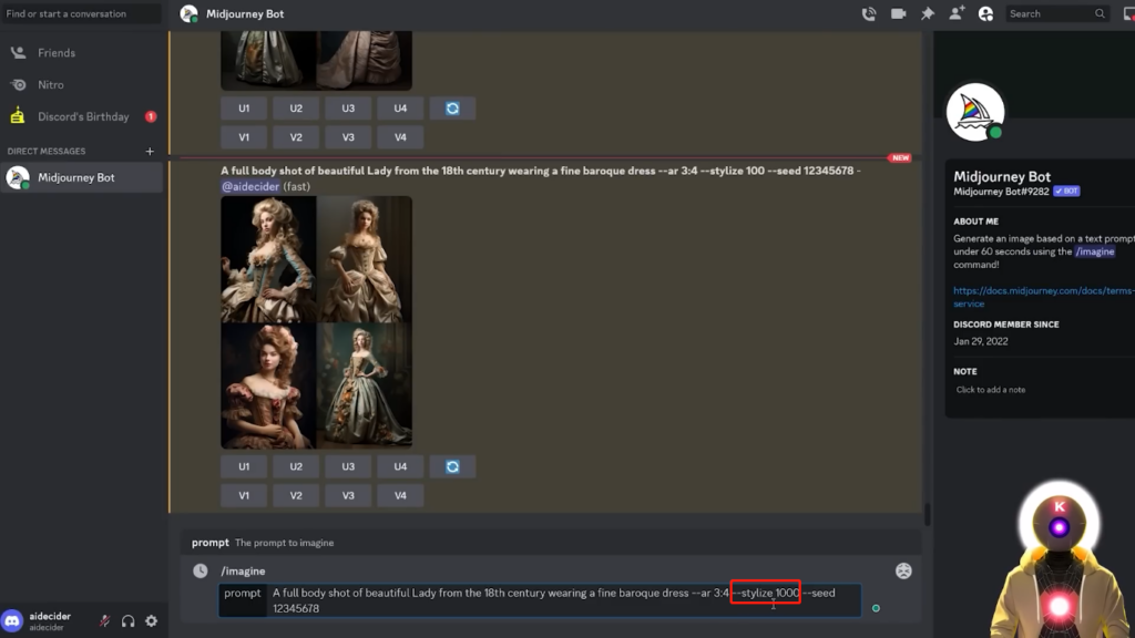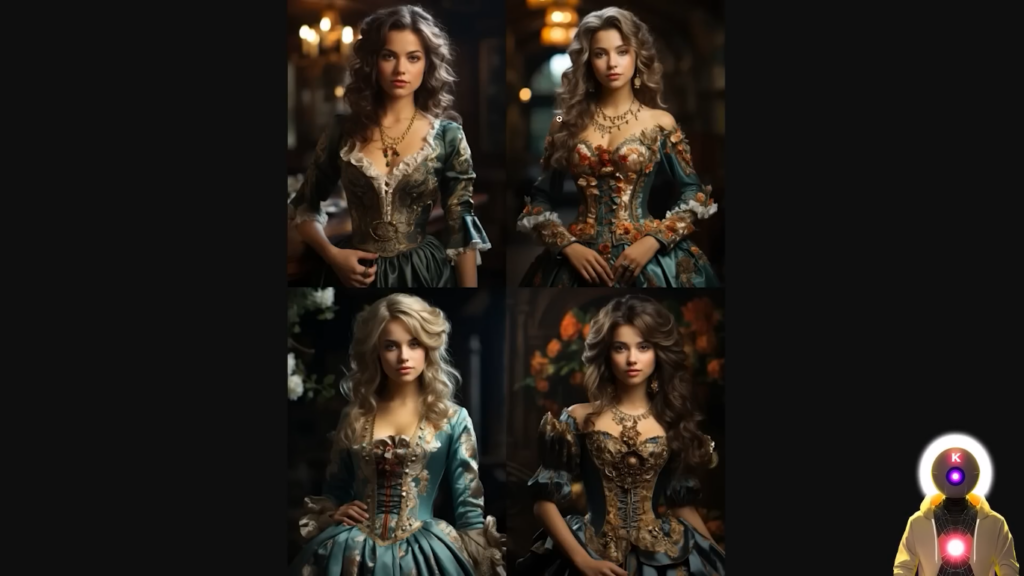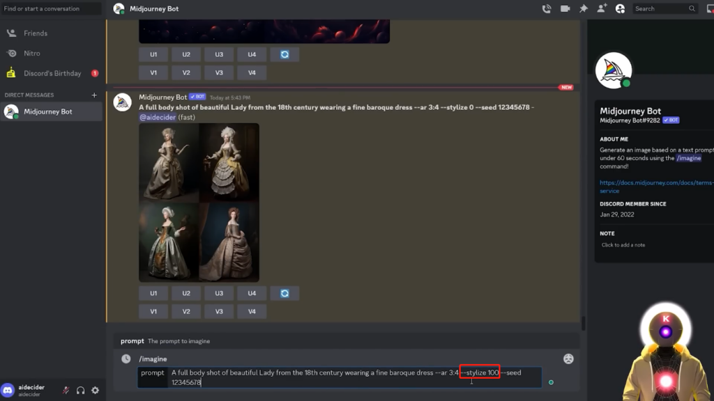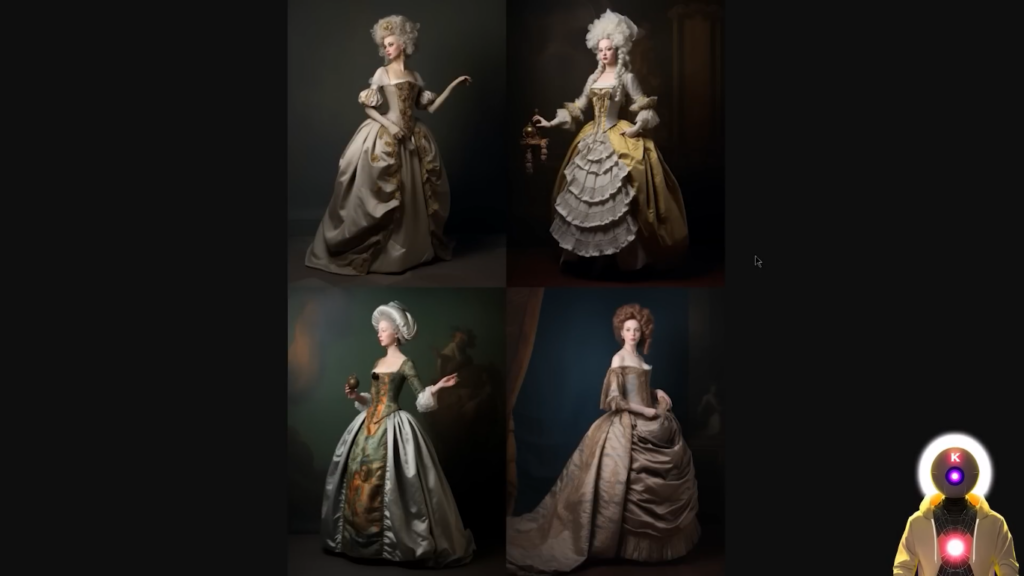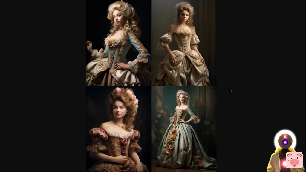 现在,他们改变的下一件事,是对风格化的论证进行了全新的改造,现在会给风格化更多的权力,所以如果我写了一些东西,比如一个18世纪的美丽女士的全身照,穿着精致的巴洛克风格的衣服, 风格化值是0,固定的种子是1,2,3,4,5,6,7,8,我们得到这样的东西,4张非常好看的图片,它们非常端庄,但我必须说它们可能有点,你懂的,无聊。