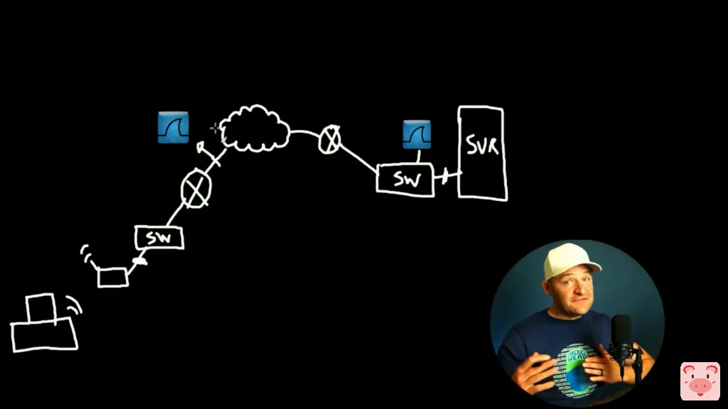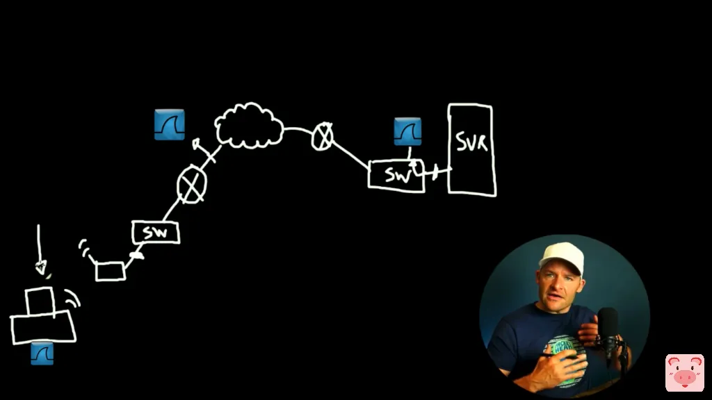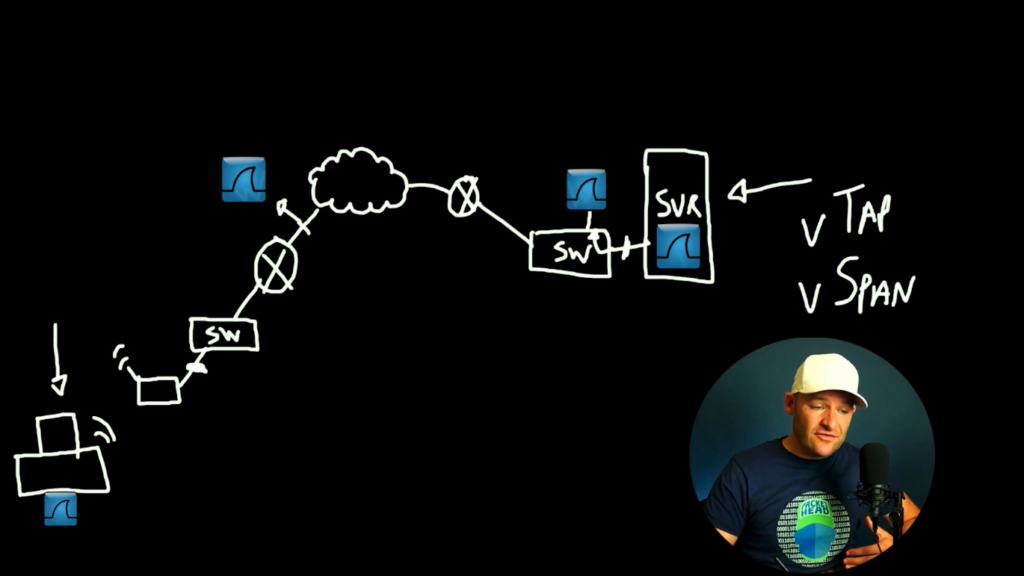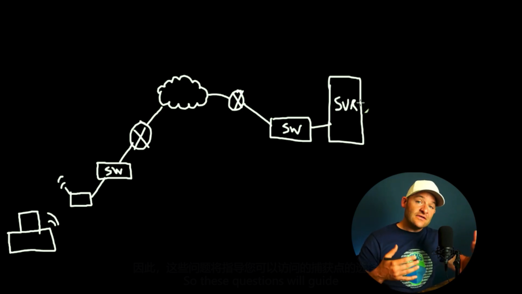 好了,谢谢你回来参加这个Wireshark教程的另一课。所以我们已经在第二课和第三课中谈到了如何用Wireshark在用户界面或命令行中进行捕获,但现在我们要谈的是在哪里捕获。所以坚持下去。好的,我们在哪里捕获问题?这是一个非常常见的问题,当我们第一次开始使用数据包捕获。我们是否在终端上捕获?我们在服务器上安装它吗?实际上,我们要放在哪里取决于问题的性质以及我们在网络中可以访问到哪些内容。所以,如果我们捕捉到一个单一的客户端的问题,连接到服务器有问题与安全事件,影响到整个网络的区域,那么这将是两个不同的捕捉点。所以我们要在头脑中非常清楚地知道,我们要用Wireshark来观察的问题是什么。在我们得到一个很好的定义之后,我们就可以更好地决定把Wireshark放在哪里。所以,让我们想象一下,我们正在排除一个间歇性的问题,其中几个用户有问题连接到一个应用程序。那么在这种情况下,我们会把Wireshark放在哪里?好的,所以在这个场景中,我只是要在客户端上非常简单地画出它。这里我们只有一个客户端,我们就说这个客户端是Wi-Fi连接的,好吗?因为许多客户端,甚至移动设备或PC了,这往往是他们连接的方式,所以我只是要画一个小连接到一个接入点,好吗?所以就在那里,我在想,好吧,无线环境,可能有其他用户在那个环境。这只是我准备考虑的问题。那我们把接入点连接到交换机上怎么样?然后从该交换机,让我们去之间的防火墙或边缘路由器,让我们只是说从那里,我们要去到我们的供应商,好吗?所以这更多的是在客户端的事情。现在,显然,在你的环境中,这可能要复杂得多,但让我们只是尝试保持简单。现在在服务器端,理想情况下,我想看到一种捕获那一端数据的方法。现在,服务器端变得很棘手,因为现在,需要考虑我们可以访问哪些系统或网络。这个服务器是在你控制的数据中心吗?你能真正访问该服务器吗?你可以访问它所连接的虚拟网络吗?如果这台服务器是AWS中的一个实例,而你只控制这个实例,外面什么都没有,怎么办?