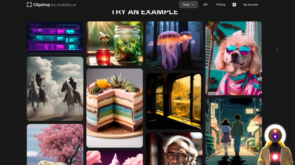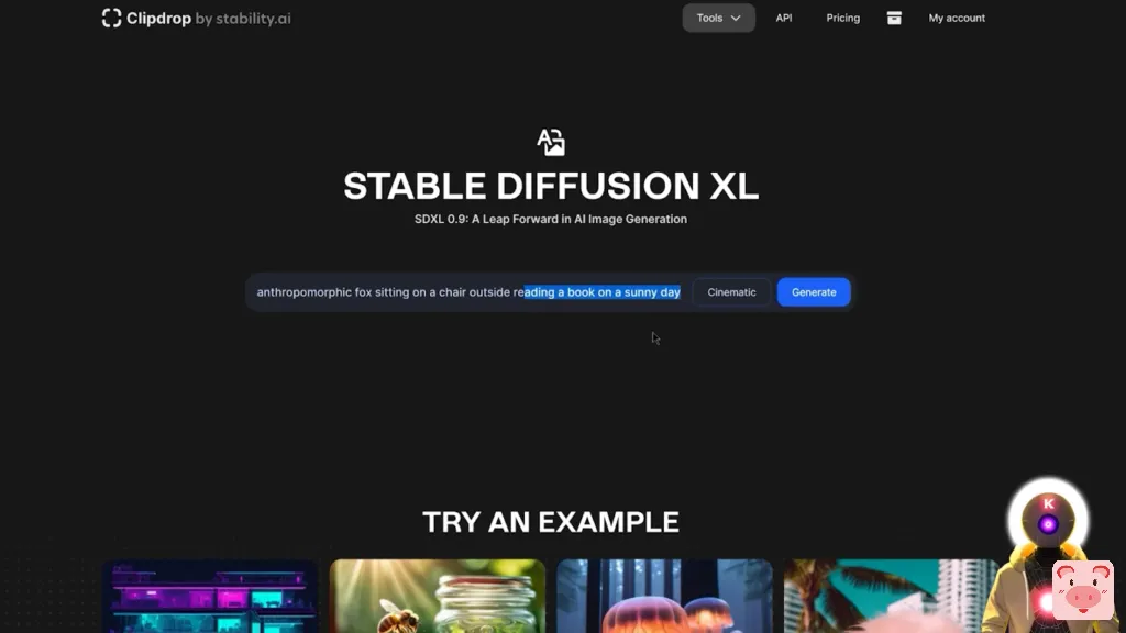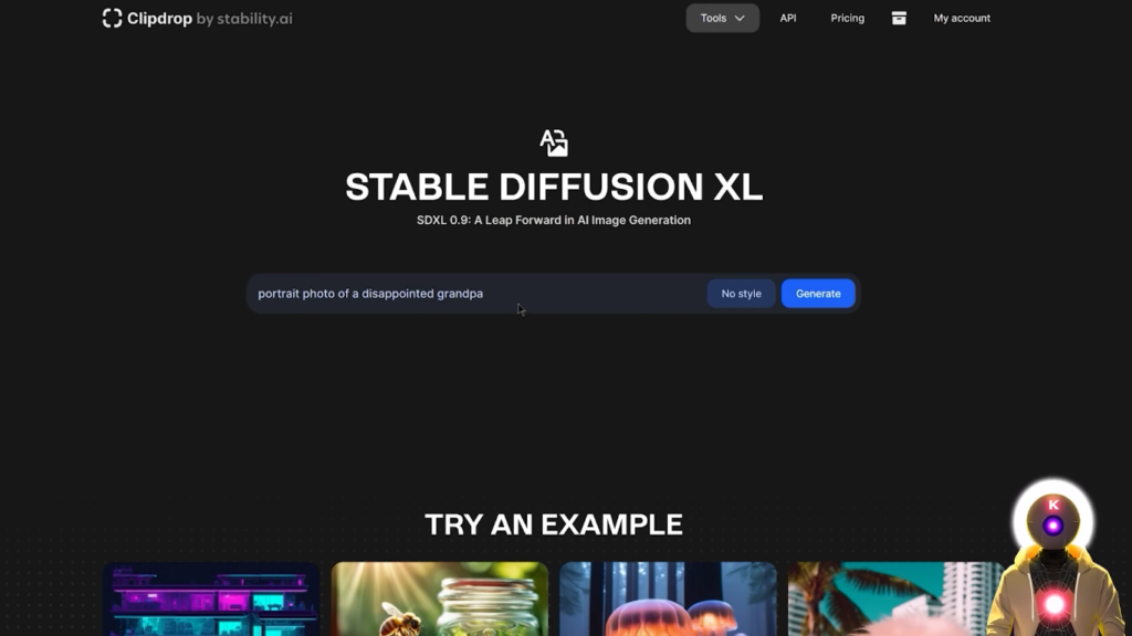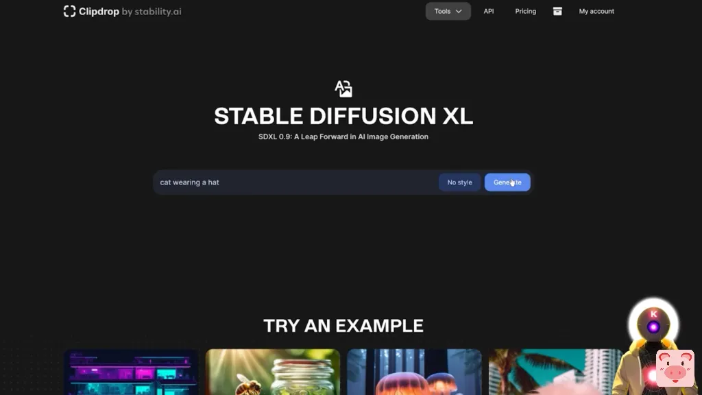 现在,我不太确定他们到底是怎么做到的,因为据我所知,以前的模型只用一个模型运行,但在这种情况下,在这个新版本中,他们设法将两个不同的模型结合在一起,生成了最终的图像。你可以在这里看到,当你把它与以前的稳定扩散XLBeta模型和新的稳定扩散XL 0.9模型并排比较时,差别是相当大的。有更多的细节,更多的分辨率,以及图像的整体一致性要好得多。狼也是如此,它看起来更好,更有美感,与以前的模型相比,更有逼真度。 现在从技术上讲,到目前为止,稳定扩散 XL 0.9 在技术上还没有真正向公众发布,你现在还不能在你的电脑上运行,因为真正的最终模型,稳定扩散 XL 1.0,将在7月中旬真正发布。但就现在而言,如果你想免费试用它,看看它有多好,你实际上可以在一个叫ClipDrop的网站上试用它。现在它是100%免费的,你不需要支付任何费用, 你可以直接来这里,输入你的提示词,然后点击生成。