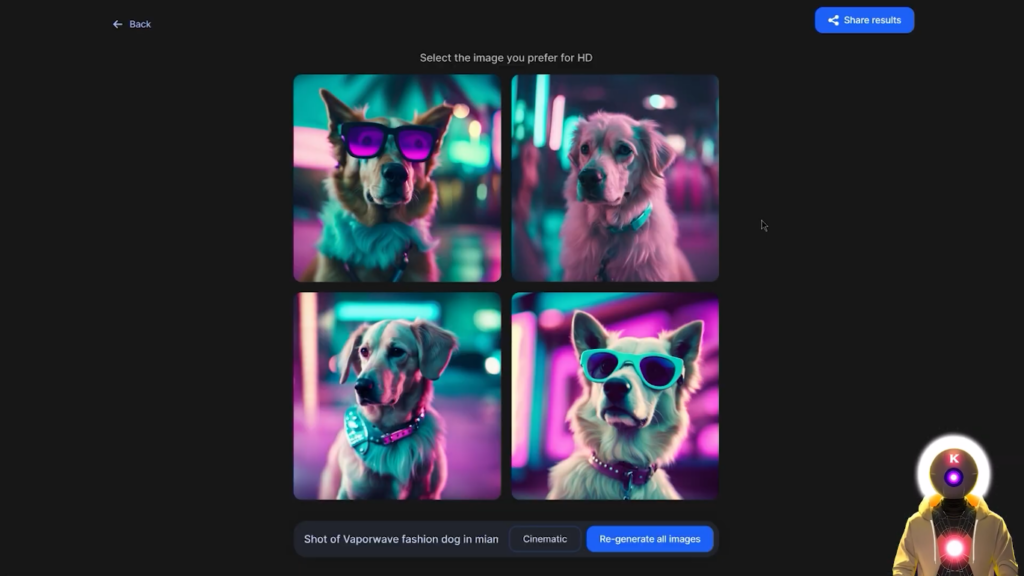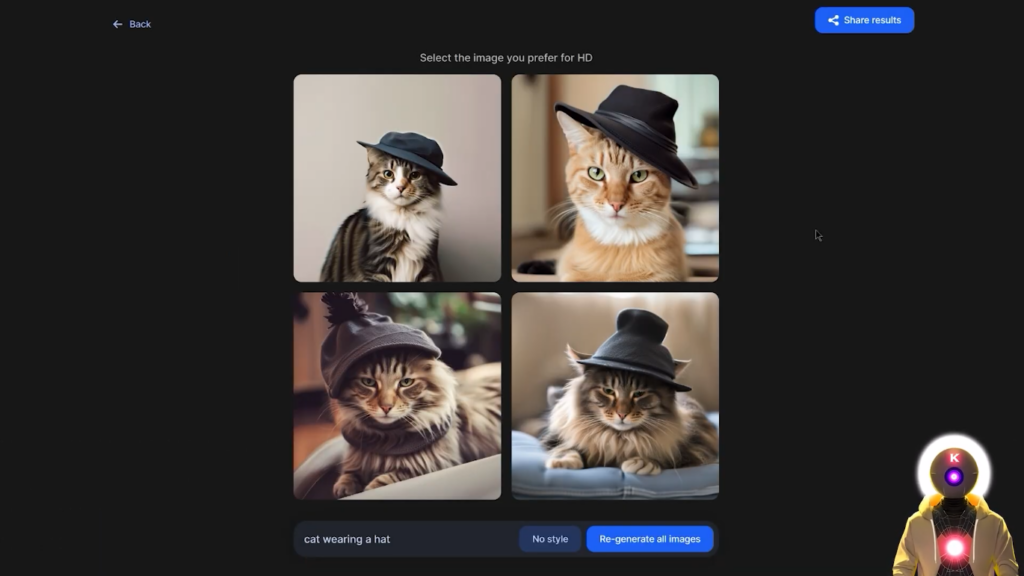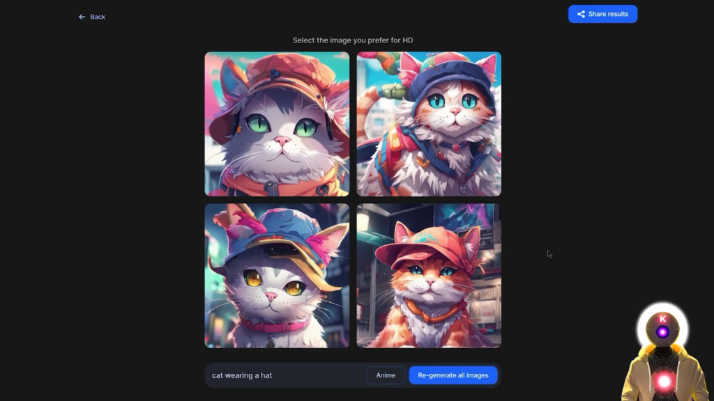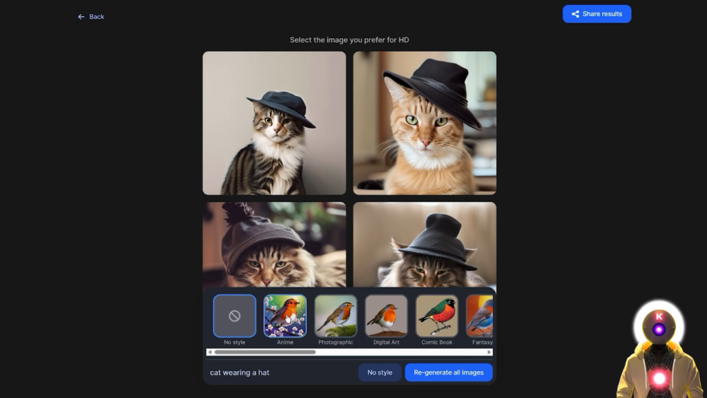 我得说,我的提示词的结果其实真的很好。我的意思是每张图片的细节,图片的连贯性,我的意思是这绝对是与Midjourney相同的水平,但你可以完全免费使用它。这里还有一个非常酷的功能,如果你点击这个小按钮,它实际上会给你一个列表,有一堆不同的风格,你可以从中选择,生成一个新的图像。因此,例如,让我们采取,我不知道,动漫,并点击重新生成所有图像,