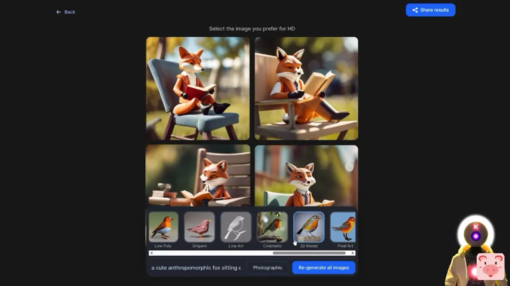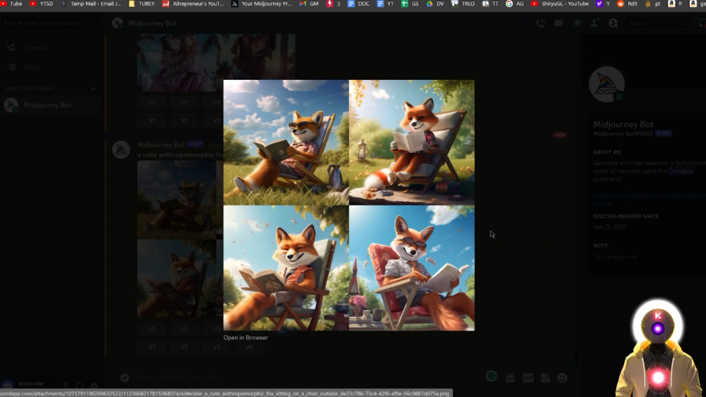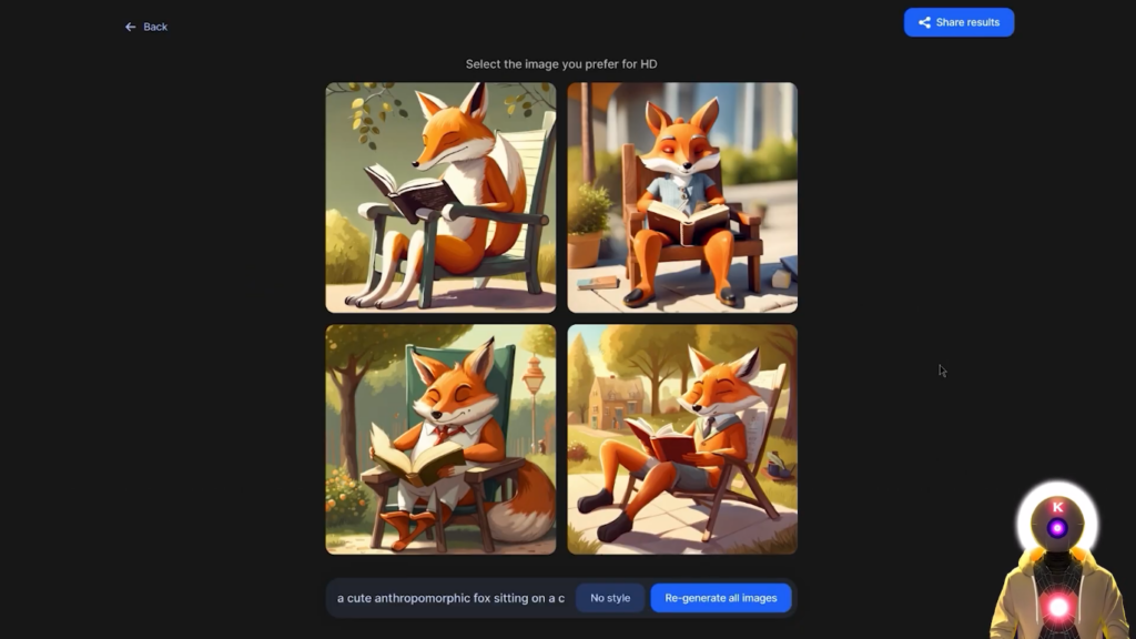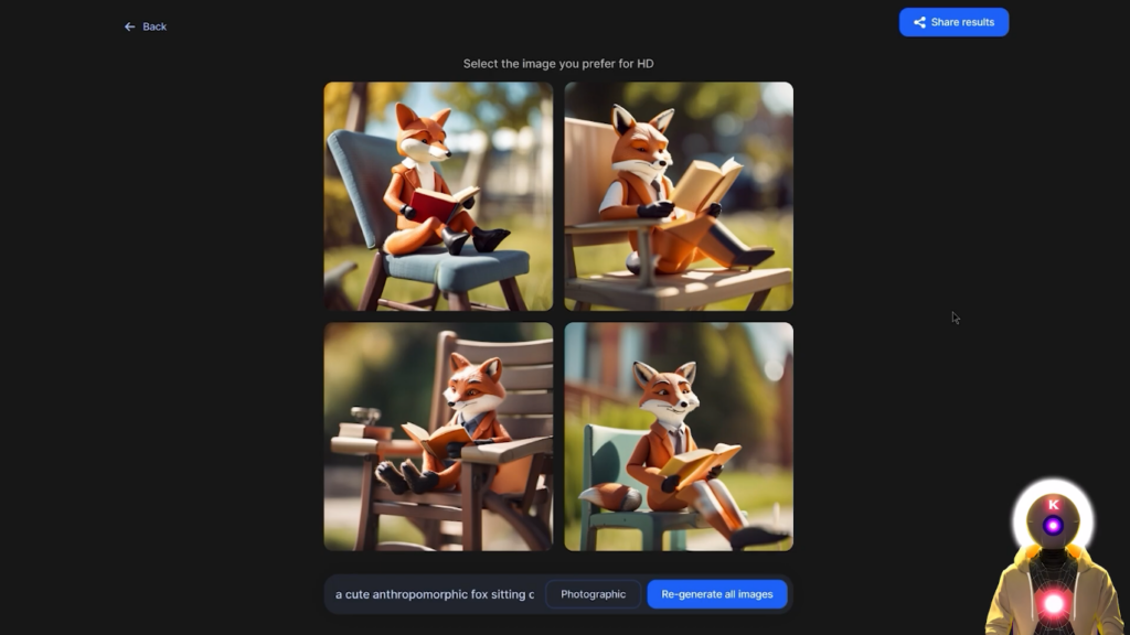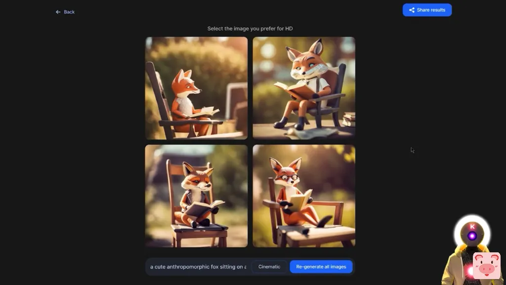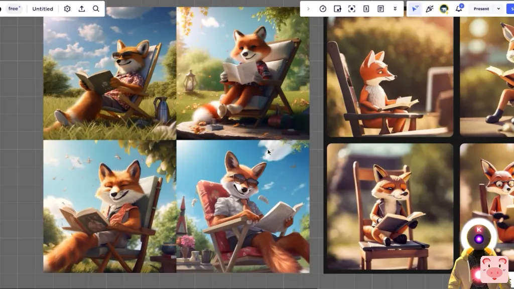 我们得到这些图片,看起来非常好,虽然我期待更多一点的逼真的东西,但这些图片绝对按照我的提示非常非常好。我们得到了只可爱的拟人化狐狸,坐在椅子上,在一个阳光明媚的日子里看书,这正是我要求的。