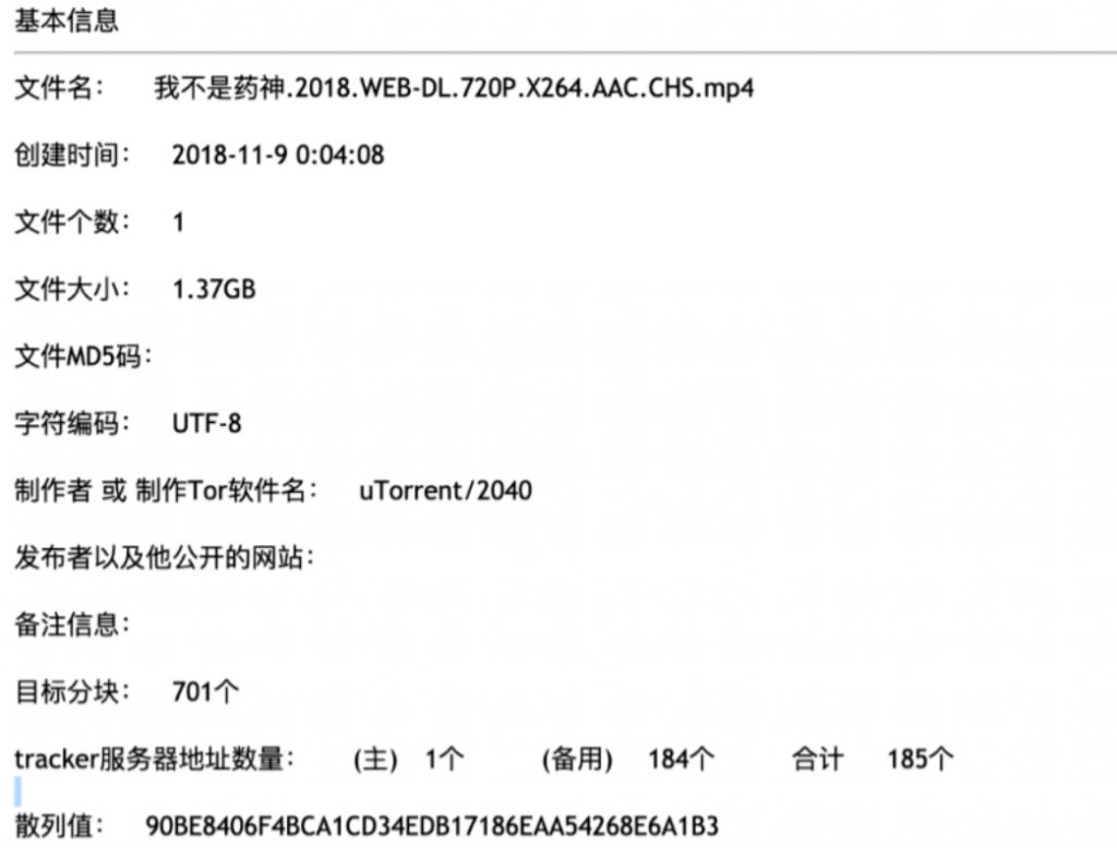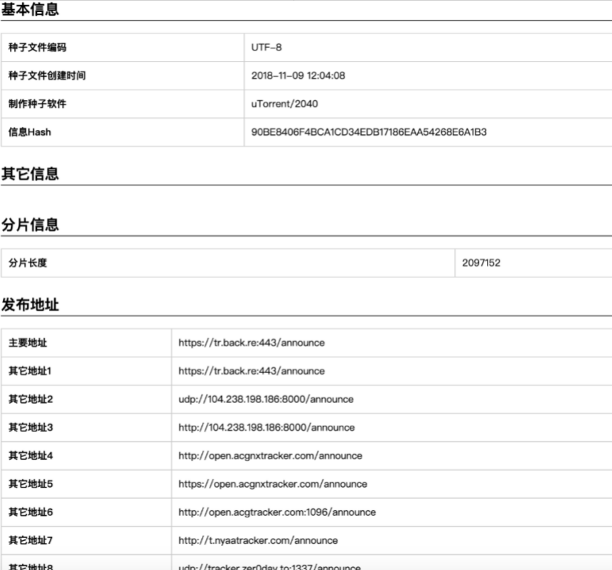 给大家介绍一个在线的torrent分析站点:http://tool.chacuo.net/commontorrentinfo,我现在想解析一个本地的torrent文件,结果如下:
