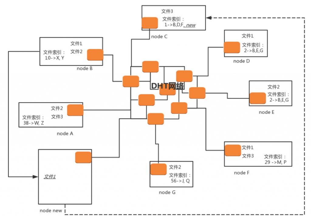 接下来一个新的节点 node new 上线了。如果想下载文件 1,它首先要加入 DHT 网络,如何加入呢?