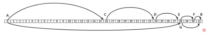 A 和 B 每一位都不一样,所以相差 31,A 找到的朋友 C,不巧正好在中间。和 A 的距离是 16,和 B 距离为 15,于是 C 去自己朋友圈找的时候,不巧找到 D,正好又在中间,距离 C 为 8,距离 B 为 7。于是 D 去自己朋友圈找的时候,不巧找到 E,正好又在中间,距离 D 为 4,距离 B 为 3,E 在朋友圈找到 F,距离 E 为 2,距离 B 为 1,最终在 F 的朋友圈距离 1 的地方找到 B。当然这是最最不巧的情况,每次找到的朋友都不远不近,正好在中间。