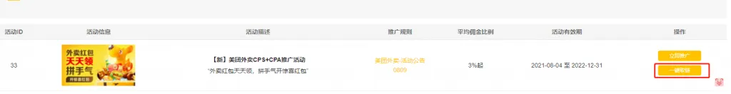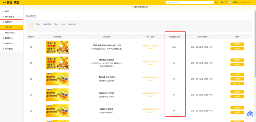 申请完联盟账户之后,可以在我要推广>活动总页看到可以推广的活动以及详细的佣金比例
