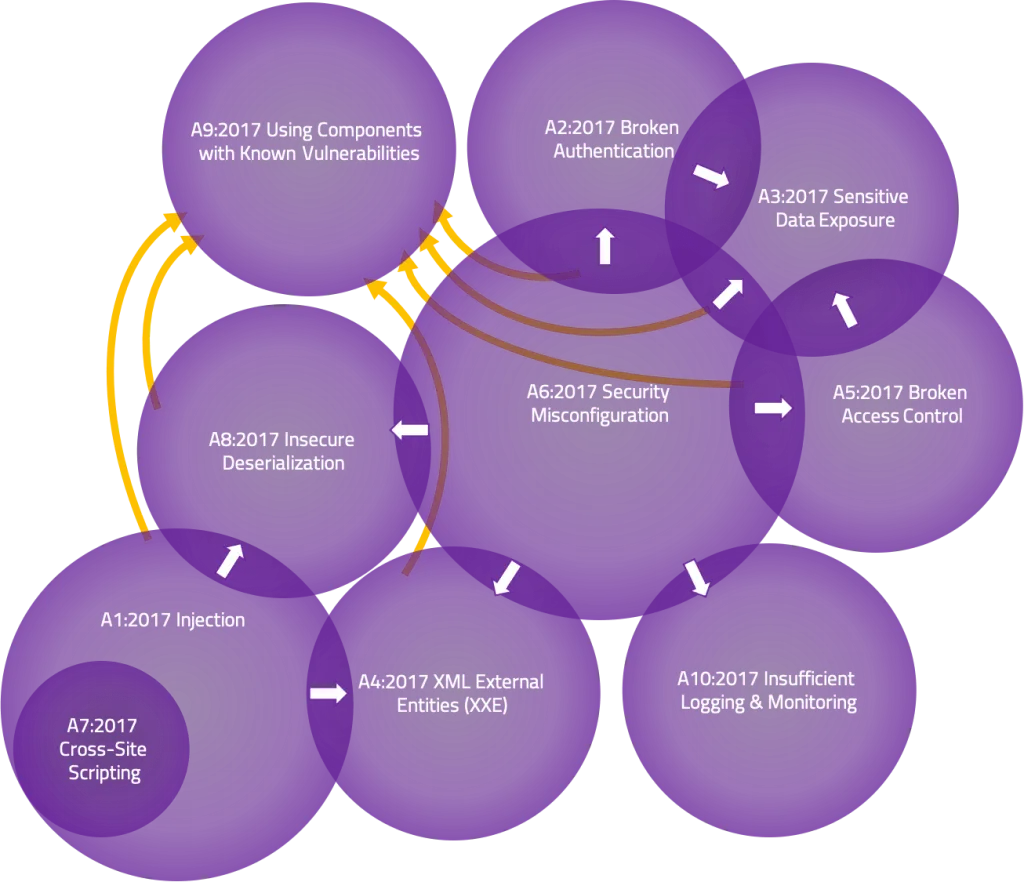 重叠只是在一个方向上。我们通常会根据最终表现或 "症状 "对漏洞进行分类,而不是根据(潜在的深层)根本原因。例如,"敏感数据暴露 "可能是 "安全错误配置 "的结果;但是,你不会在另一个方向看到它。因此,在交互区画上箭头,以表明它发生的方向。
