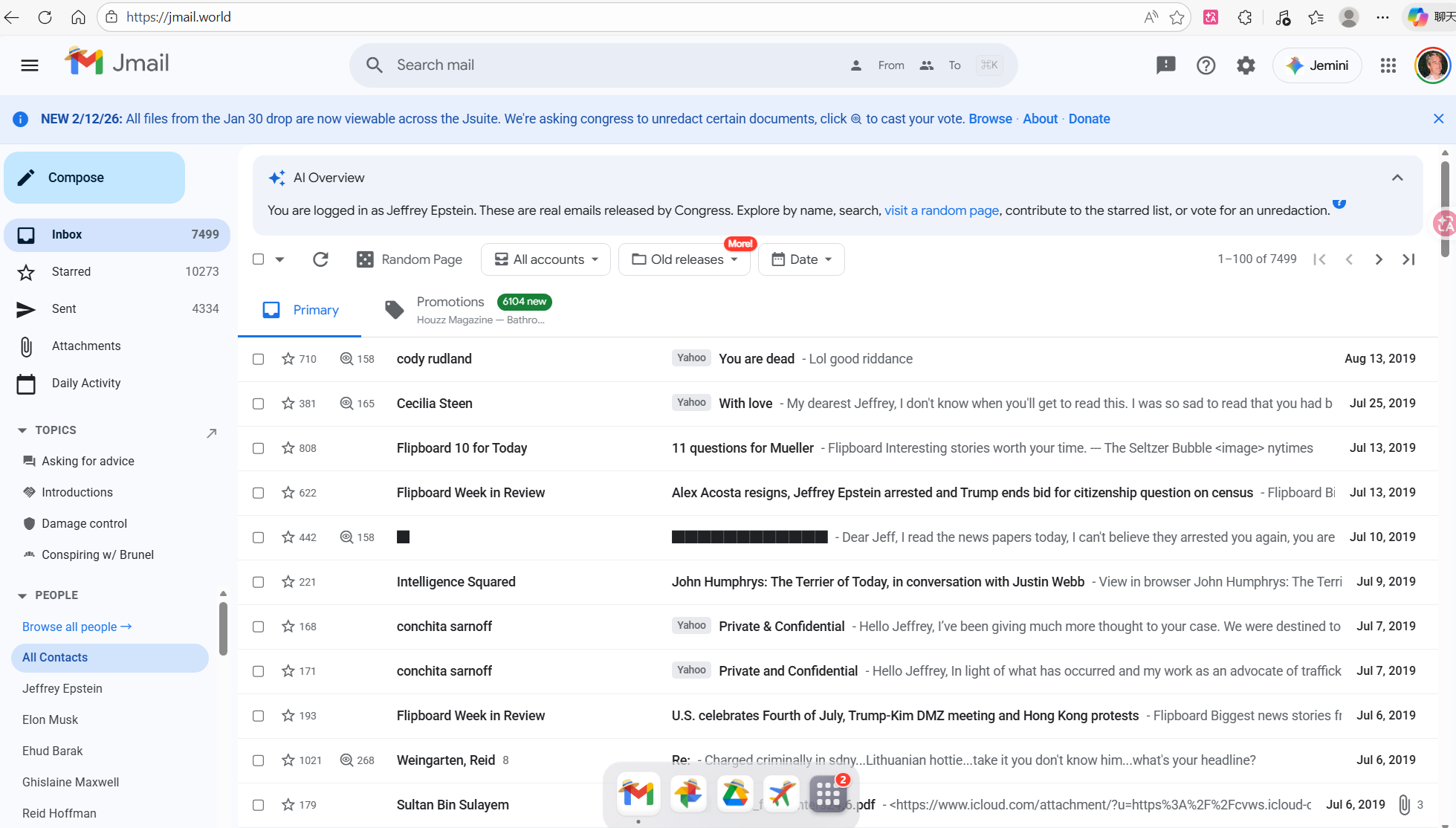 网友用 谷歌的Gmail 界面风格,展示了公开发布的真实电子邮件档案的网站。