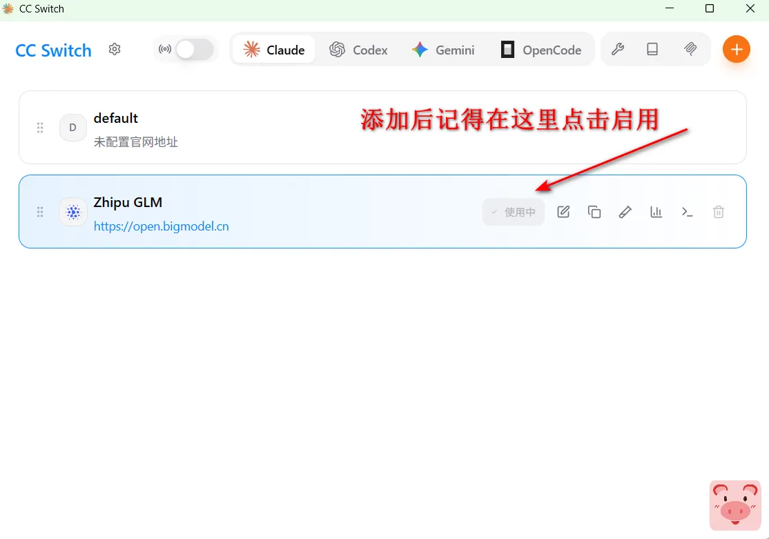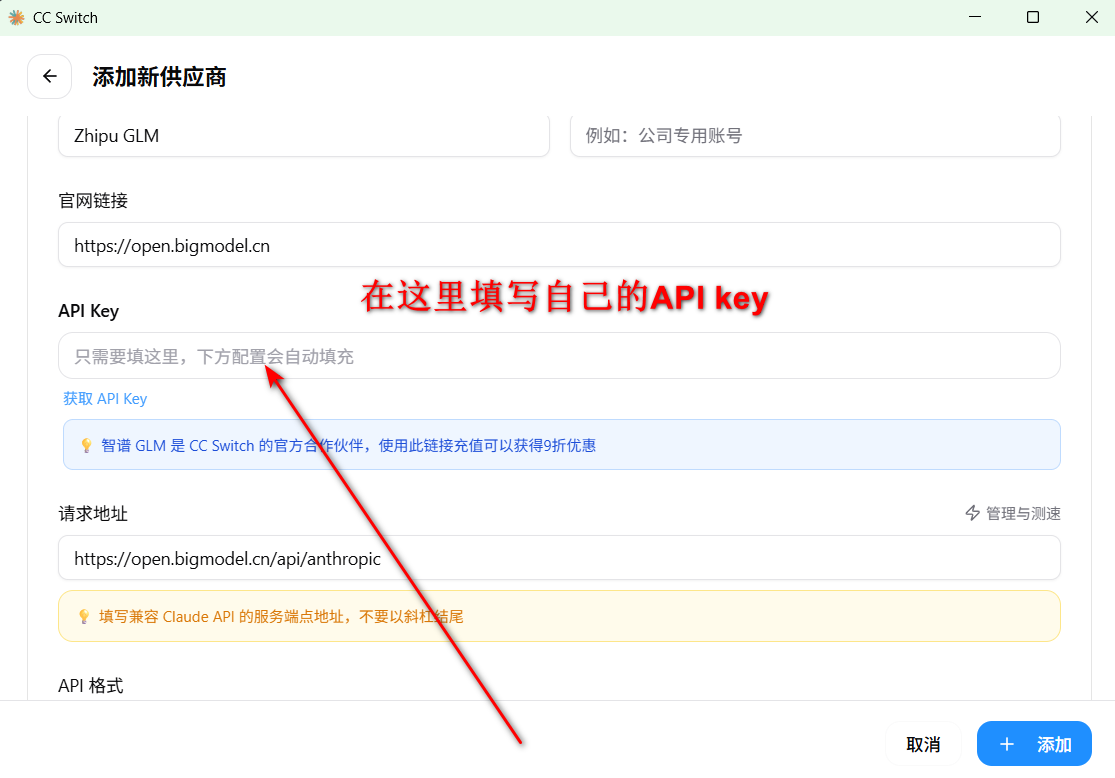 把api key 复制到 我们的cc swich的对应位置 然后点击添加 并且记得点击启用 这时候就已经配置好CC Switch啦
