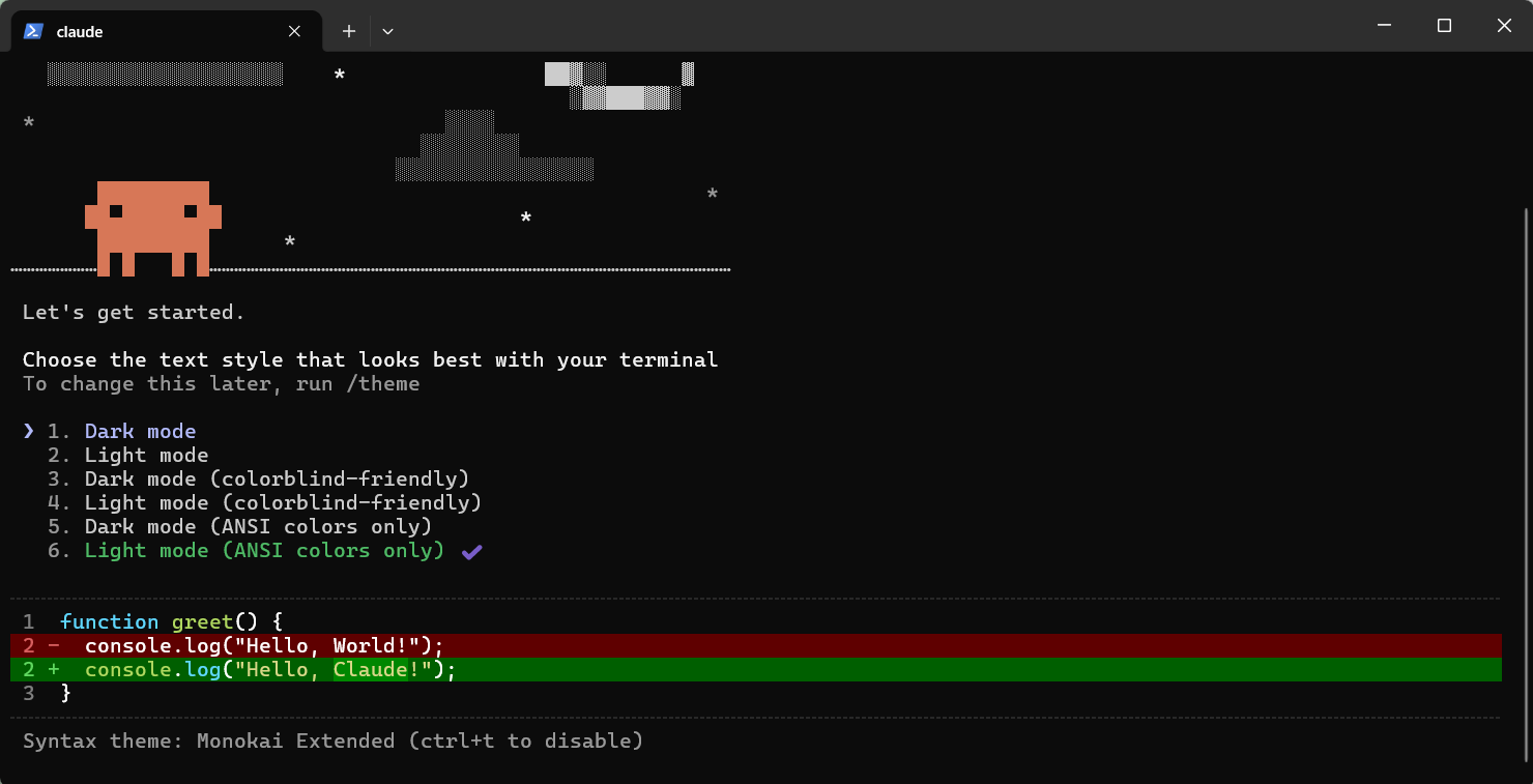 然后重启powershell 在命令行中输入 claude 回车 看到下图就说明环境变量已经配置完成了