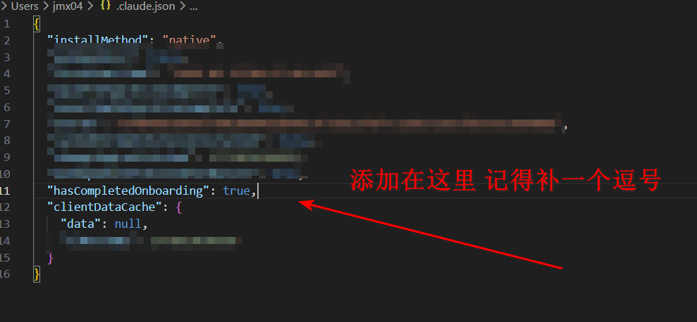 .claude.json这个文件。用 VSCode 或其他文本编辑器打开它,在里面加入一行代码并保存: