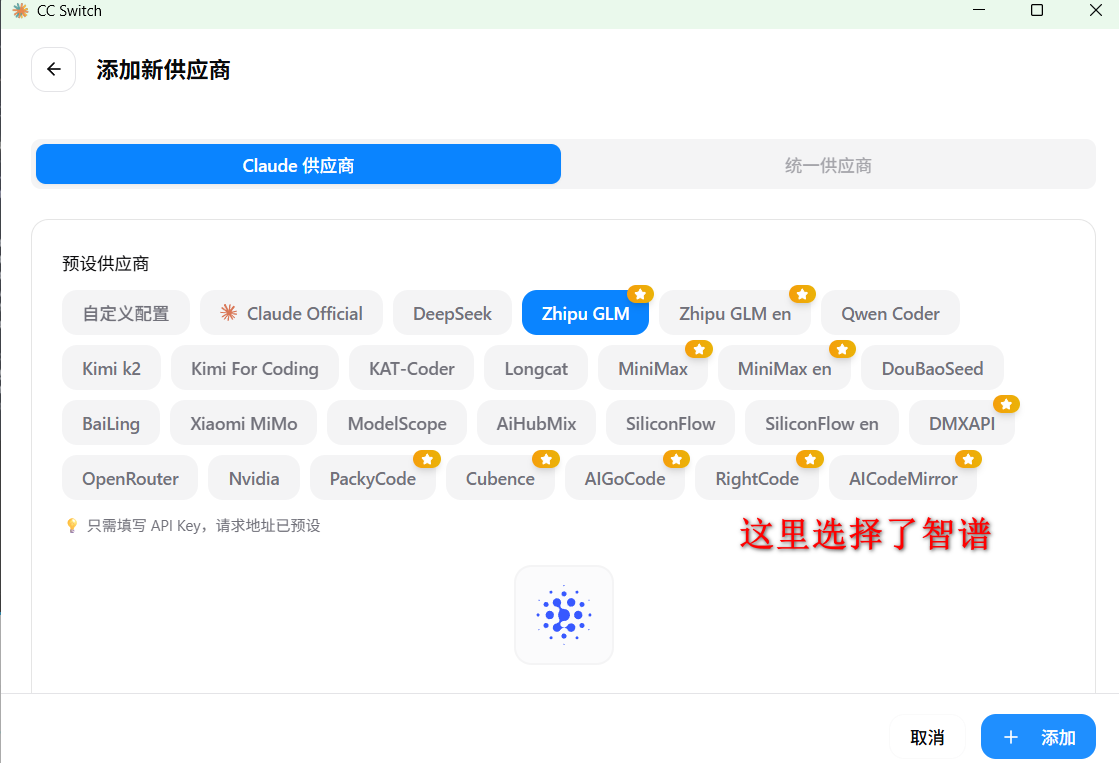 下载后无脑“下一步”安装即可。打开软件,点击右上角的 “+” 号添加大模型提供商。CC Switch 已经帮我们预设了市面上几乎所有主流厂商的配置参数,你只需要:
