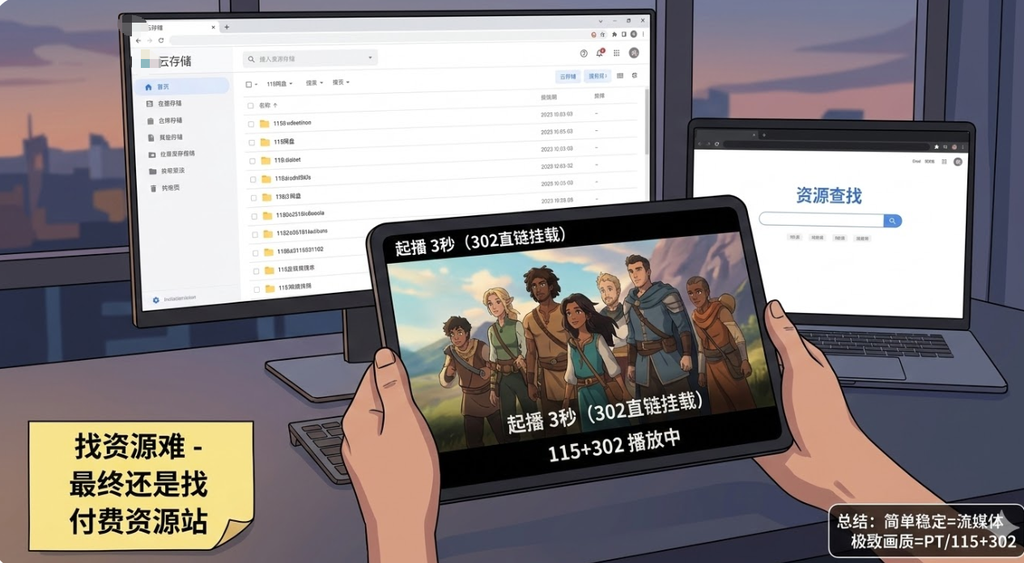 115 用来存资源,302 用来把网盘视频转成直链,然后挂到 Emby 或播放器直接在线播放。