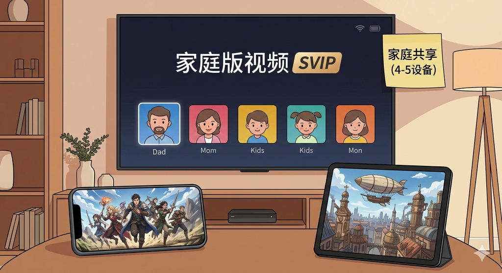 1:第一步,我开的是 腾讯视频家庭版 SVIP(价格两百多一年,和普通 SVIP 差不多)。我开这个主要是因为家庭版可以把每个人的观影记录分开,并且同时观看的设备数量也会多一些,大概可以四到五台设备同时使用。