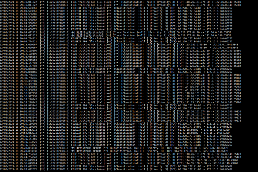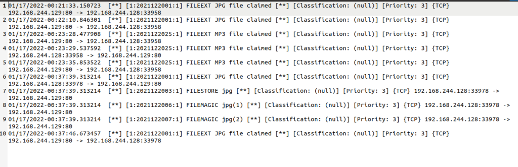 然后我们去看一下suricata中fast.log日志,看看有没有告警,发现有JPG、MP3文件还原
