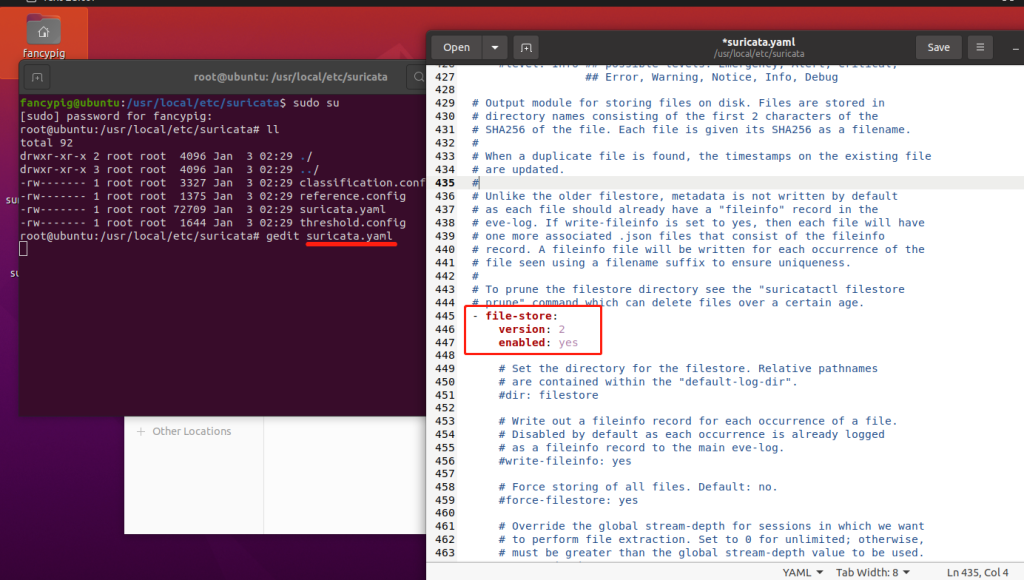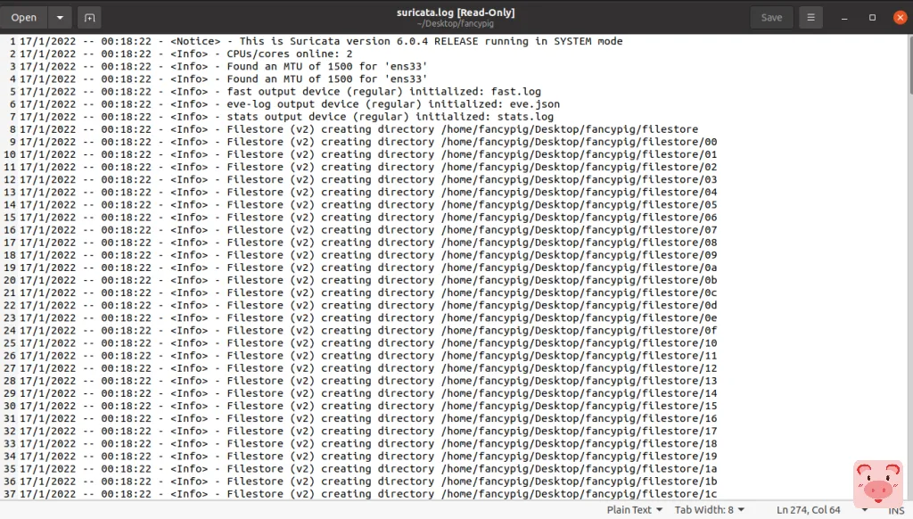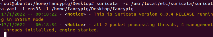 suricata -c /usr/local/etc/suricata/suricata.yaml -i ens33 -l /home/fancypig/Desktop/fancypig