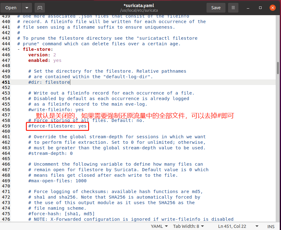 - 如果要还原全部文件,force-filestore: yes前面的#去掉(默认只还原触发告警的文件)