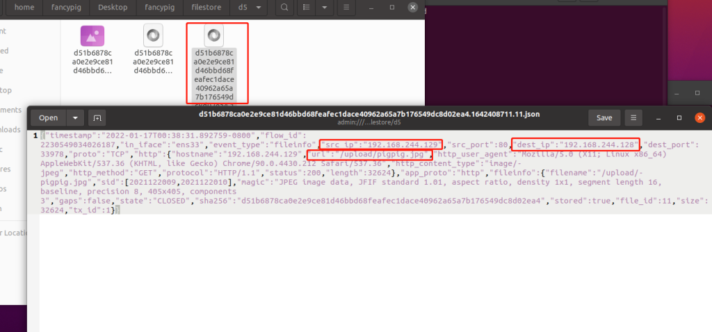 你还可以通过.json文件查看这个流量的具体信息,这里可以看到源IP是192.168.244.129(服务器),目的IP是192.168.244.128(客户端)这里的url是/upload/pigpig.jpg