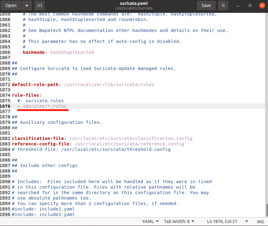 然后需要修改配置suricata.yaml,引入idsrules文件夹