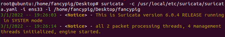 suricata -c /usr/local/etc/suricata/suricata.yaml -i ens33 -l /home/fancypig/Desktop/fancypig
