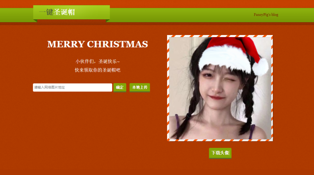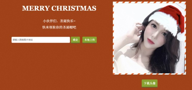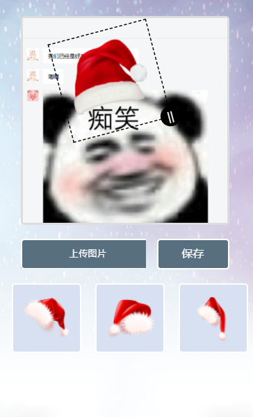 图片不会上传到服务器,完全JS实现,只有一种圣诞帽,添加圣诞帽到图片合成,然后直接保存。