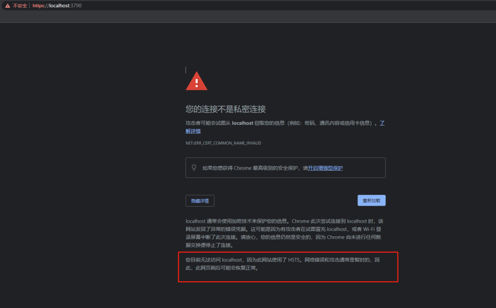 您目前无法访问 localhost,因为此网站使用了 HSTS。网络错误和攻击通常是暂时的,因此,此网页稍后可能会恢复正常。
