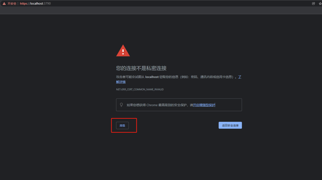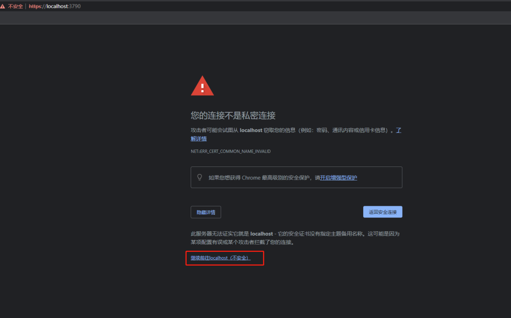 localhost 通常会使用加密技术来保护您的信息。Chrome 此次尝试连接到 localhost 时,该网站发回了异常的错误凭据。这可能是因为有攻击者在试图冒充 localhost,或者 Wi-Fi 登录屏幕中断了此次连接。请放心,您的信息仍然是安全的,因为 Chrome 尚未进行任何数据交换便停止了连接。