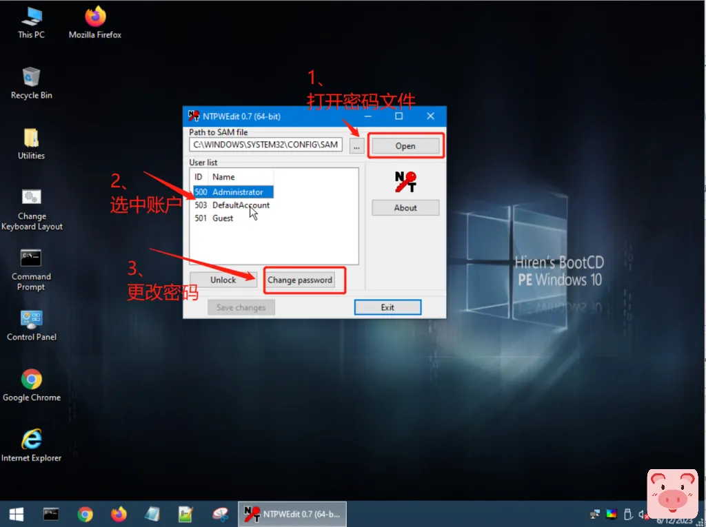 - 注意,需要首先到NT Password Edit中确认文件路径为C:\Windows\System32\config\SAM