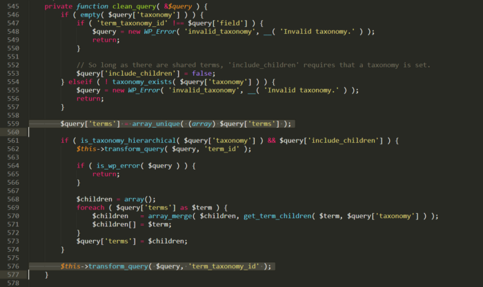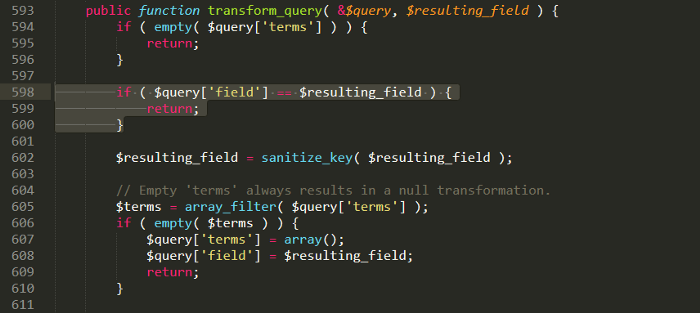 该函数transform_query将检查$query['field'] == $resulting_field,如果为真,则返回并且不做进一步处理,所以如果变量$query['field']是term_taxonomy_id,我们可以在不改变变量值的情况下退出函数$query['terms']。