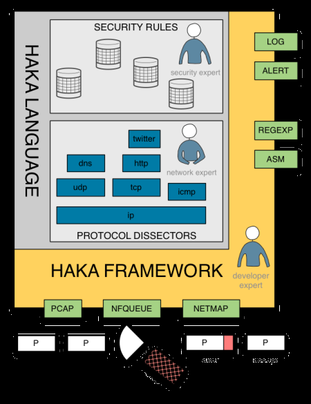 Haka内嵌到了一个模块化框架中,其中包括几个数据包捕捉模块(pcap, nfqueue),能允许终端用户在实时捕捉到的流量上应用自己的安全策略,或者是在一个数据包跟踪文件上重现这个安全策略。这个框架还提供了记录(syslog)和报警模块(syslog,elasticsearch)。报警遵循了一种类似IDMED的格式。最后,这个框架还具有附属模块,比如模式匹配引擎和一个指令反汇编模块。这些模块允许编写精密的安全规则来检测经过混淆的木马。因为Haka是按照模块方式设计的,所以用户可以通过额外的模块来扩展其功能。