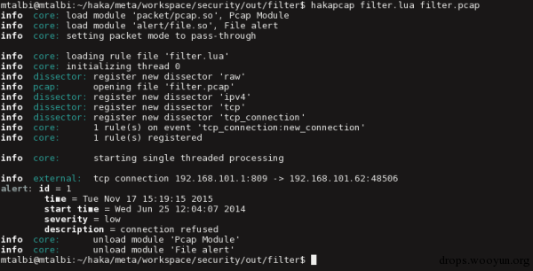 我们使用hakapcap工具在一个pcap追踪文件filter.pcap上,测试了我们的规则filter.lua: