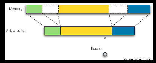在讲解流过滤前,我们首先要说明的是Haka如何在内部管理数据包和流。在Haka中,所有的数据包和流都会用虚拟缓冲区(见下图)来表示。虚拟缓冲区是一种非相邻内存块的统一视图。这些虚拟缓冲区能允许简单和有效的修改内存数据。虚拟缓冲区使用分散列表来表示非相邻数据块,避免分配和复制不必要的内存块。Haka提供了迭代器来导航通过这些内存块。这些迭代器可以通过拦截让停用一些函数,然后,比如当流上有更多可用的数据时,透明地恢复这些函数的执行。
