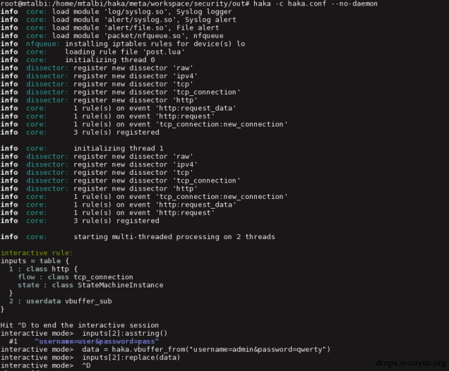从这里往下就是Haka的输出,Haka转储了一些关于已加载剥离器和已注册规则的信息。这个输出显示Haka成功拦截了目标地址192.168.101.62的连接: