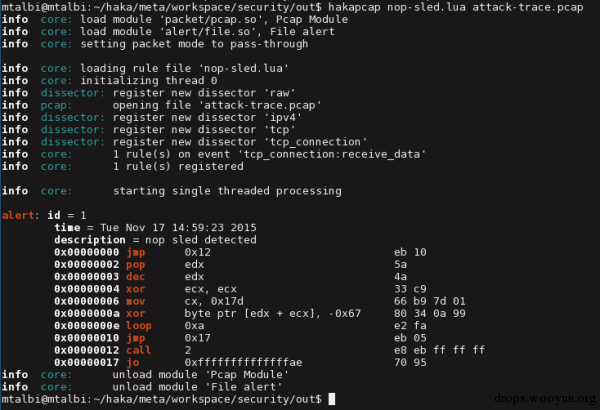 Haka还有一个模式匹配引擎和一些反汇编模块。这两个模块都是基于流的模块,能让我们检测到分散在多个数据包中的恶意有效载荷。下面的规则使用了一个常规表达来检测nop sled。我们启用了流选项,也就是说,匹配函数会拦截和等待可用的数据来进行匹配。如果检测到nop sled,我们就会发出警告,并转储shellcode指令。注意,模式匹配函数会更新迭代器的位置,之后会指向shellcode。